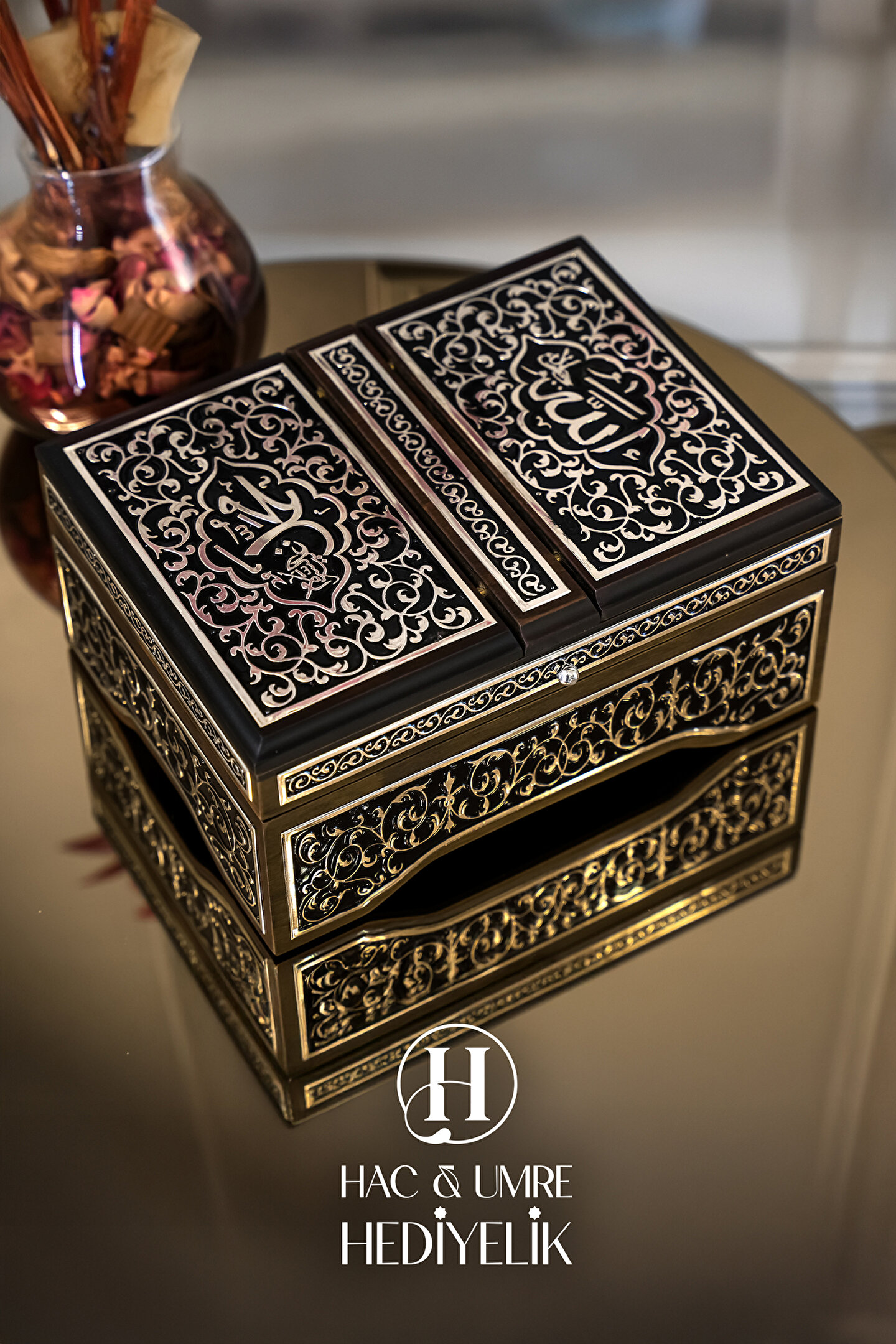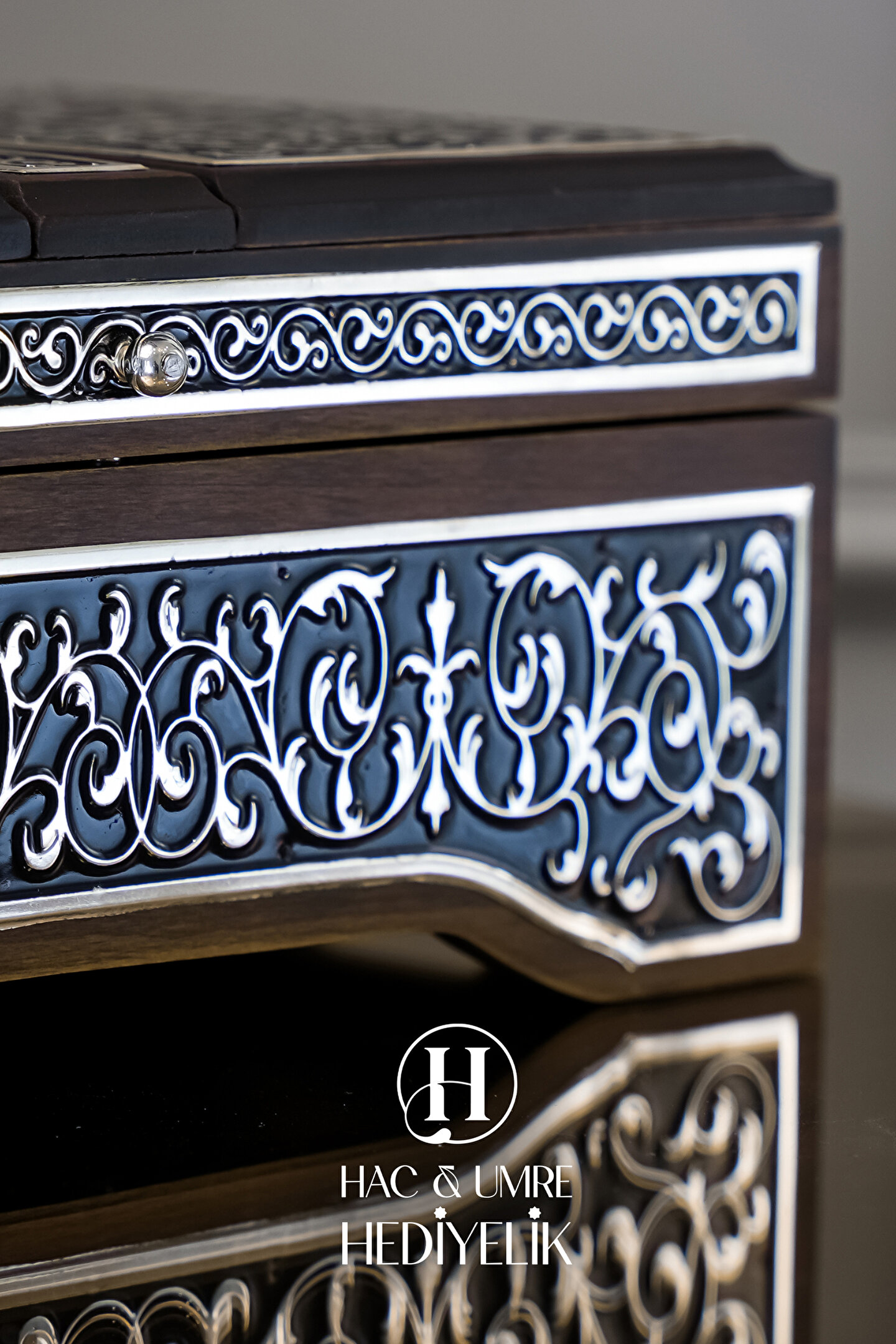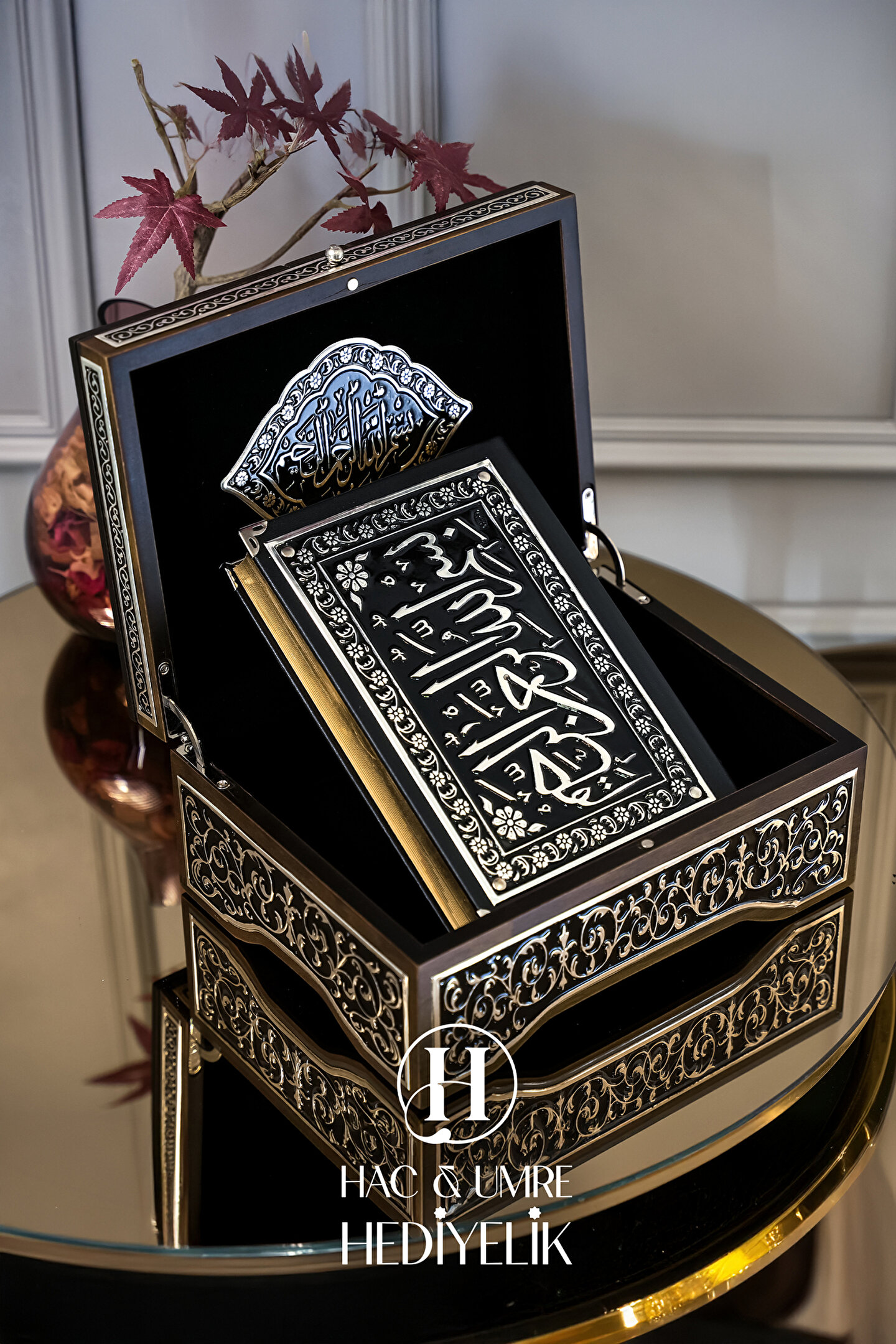 Hac Umre Hediyelik Kutulu Kuran, Kuranı Kerim, Hediyelik Kuran, 925 Gümüş İşlemeli Masif Ahşap Kutu ve Kuranı Kerim Set