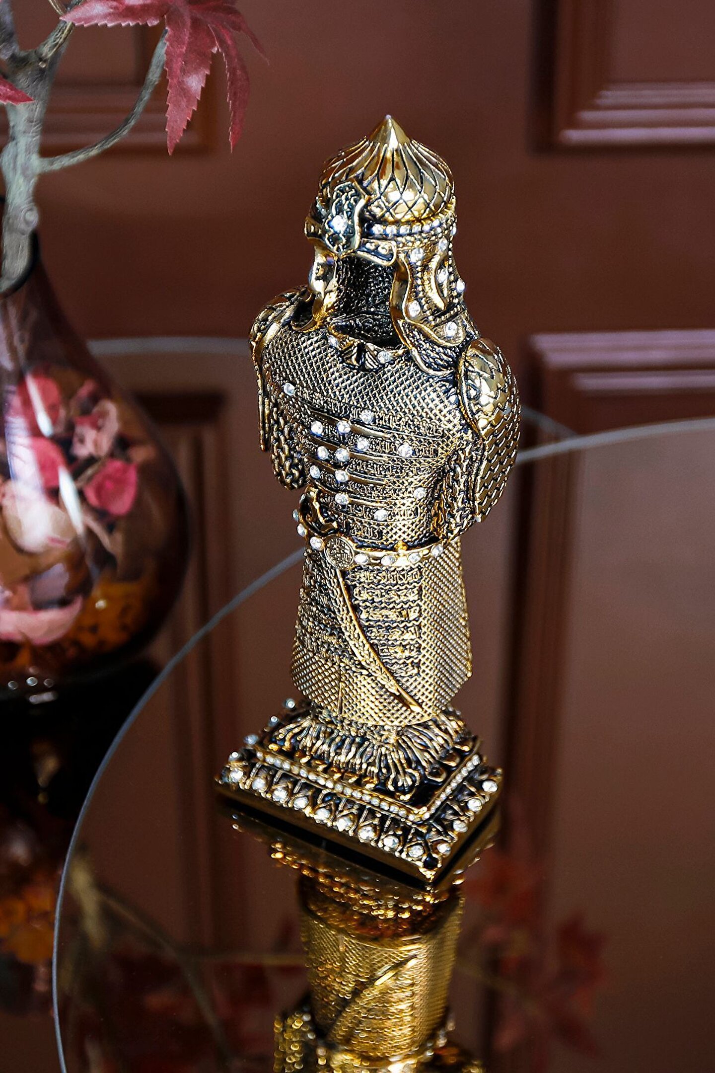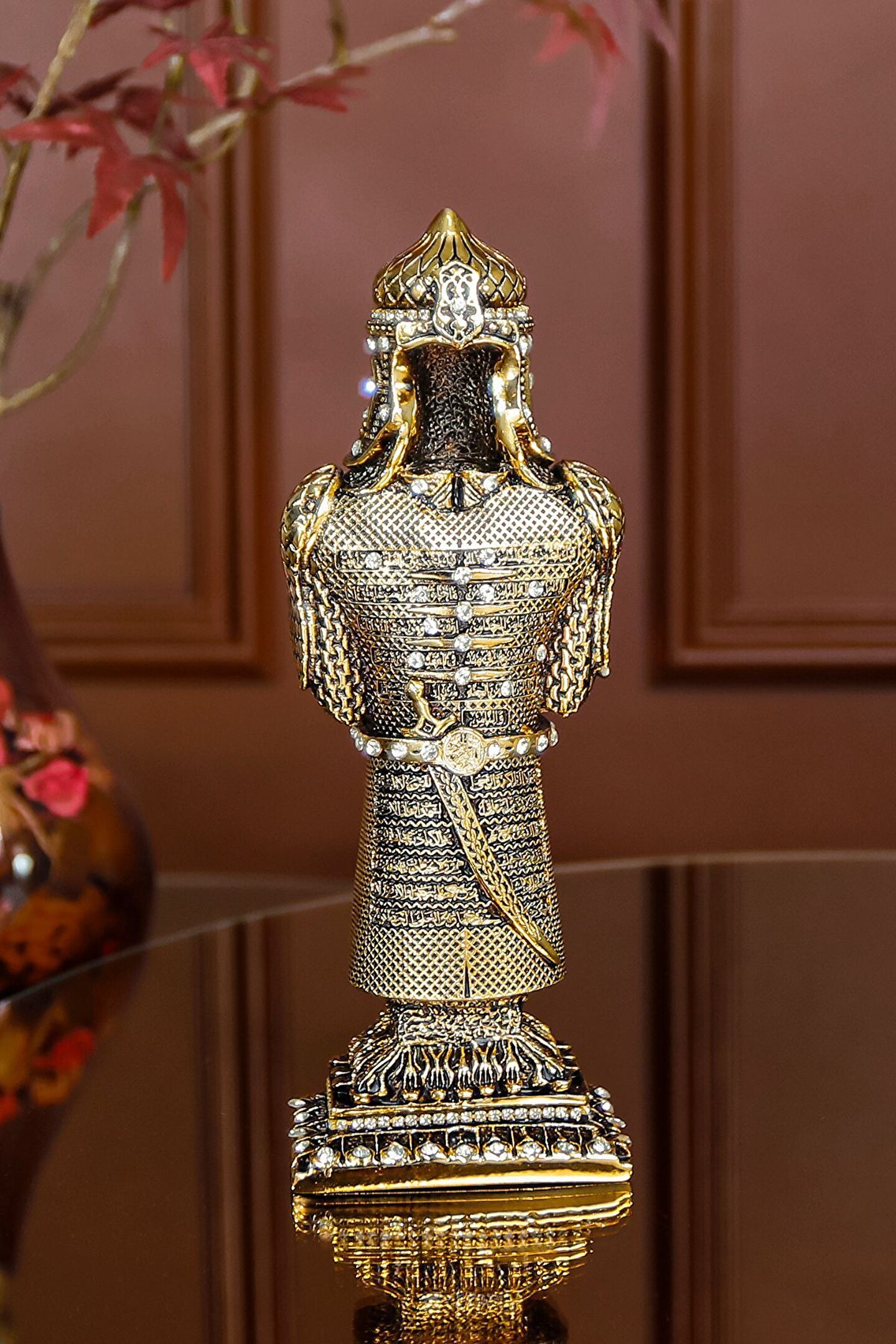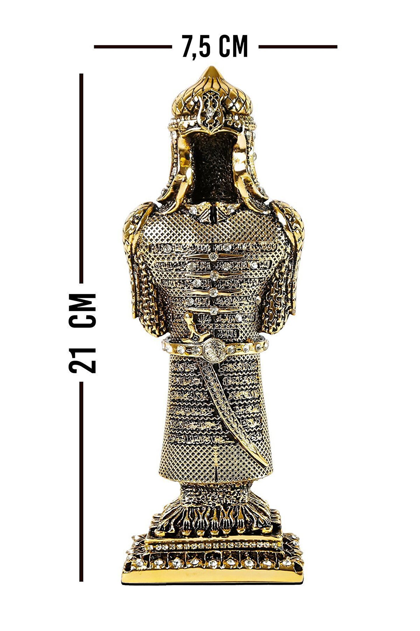 Zarafet ve İhtişam |Osmanlı Askeri Zırh Biblo ? Osmanlı döneminde askeri zırhlar, savaşçıların hayati organlarını korumak, dayanıklılıklarını artırmak ve düşman saldırılarına karşı savunma sağlamak amacıyla kullanılmıştır; Zırhlar genellikle özel ustalar tarafından el yapımı olarak üretilir ve savaşçının statüsüne, kullanımına ve savaş stratejilerine göre özelleştirilirdi; ? Osmanlı askeri zırhları genellikle dökme demir, çelik ve özel işlenmiş metal alaşımları kullanılarak yapılmıştır; Zırhlar, muazzam bir ustalıkla tasarlanmış ve süslenmiş, Osmanlı İmparatorluğu'nun zengin sanat geleneğini yansıtan detaylı desenler ve kabartmalarla süslenmiştir; Bu zırhlar, Osmanlı askeri gücünün yanı sıra imparatorluğun sanatsal ve kültürel mirasını da temsil eder; ?? Detaylı zırh tasarımımız, o dönemin askeri zanaatının bir şaheseri olarak evinize geleneksel bir zarafet katarken, aynı zamanda bir tarih dersi sunar; Bu biblo, koleksiyonerler için eşsiz bir parça olmanın yanı sıra, ev / ofis dekorasyonu için ve hediyelik olarak mükemmel bir seçenektir; ? Hemen sipariş için ürün kodu: CN 53 ? Ürün Özellikleri: Orijinal Tasarım El Yapımı ve Yüksek Kaliteli Metalize Sert Polyester Malzeme Altın Kaplama 7,5x21 cm 510 gr El İşçiliği ? Kullanım Alanları: Yaşam alanlarına zarafet katmak için, Manevi bir hediye olarak, Dekoratif süs olarak, Anneye, Babaya, Eşe Hediye olarak, Yıldönümü, Doğum Günü, Terfi, Ev ve Ofis Hediyesi Olarak, Bereketin simgesi olması için, Maneviyatı hatırlatması için, Başarı ve sanatsal üretime ilham olması için, Kurumsal hediye ve diğer alanlarda kullanılabilir;