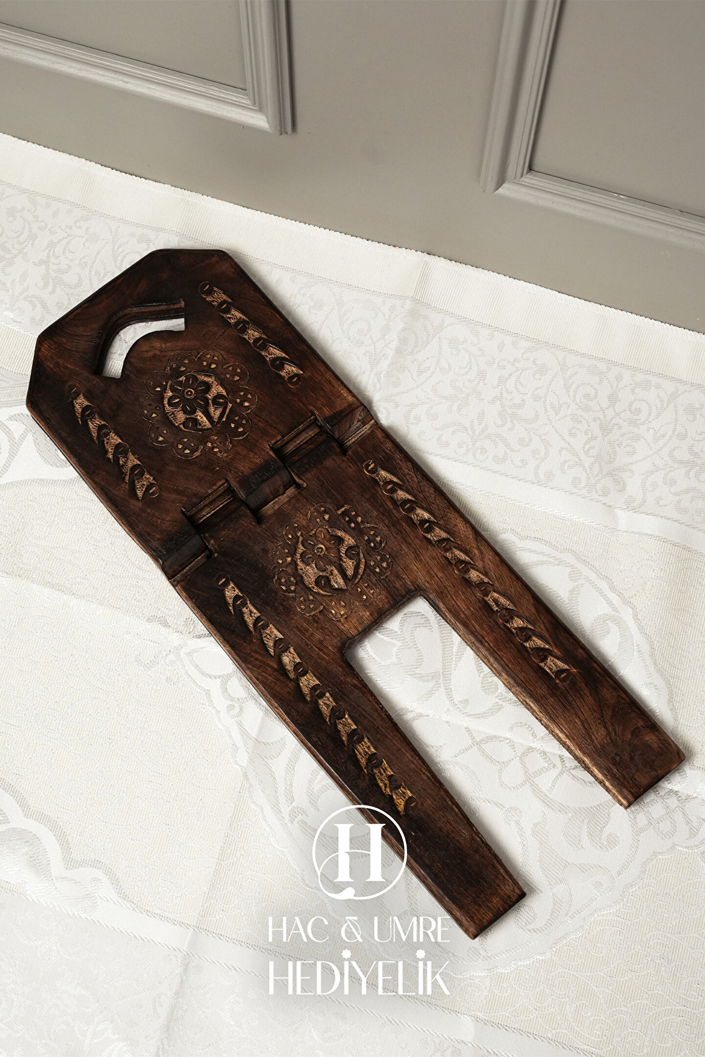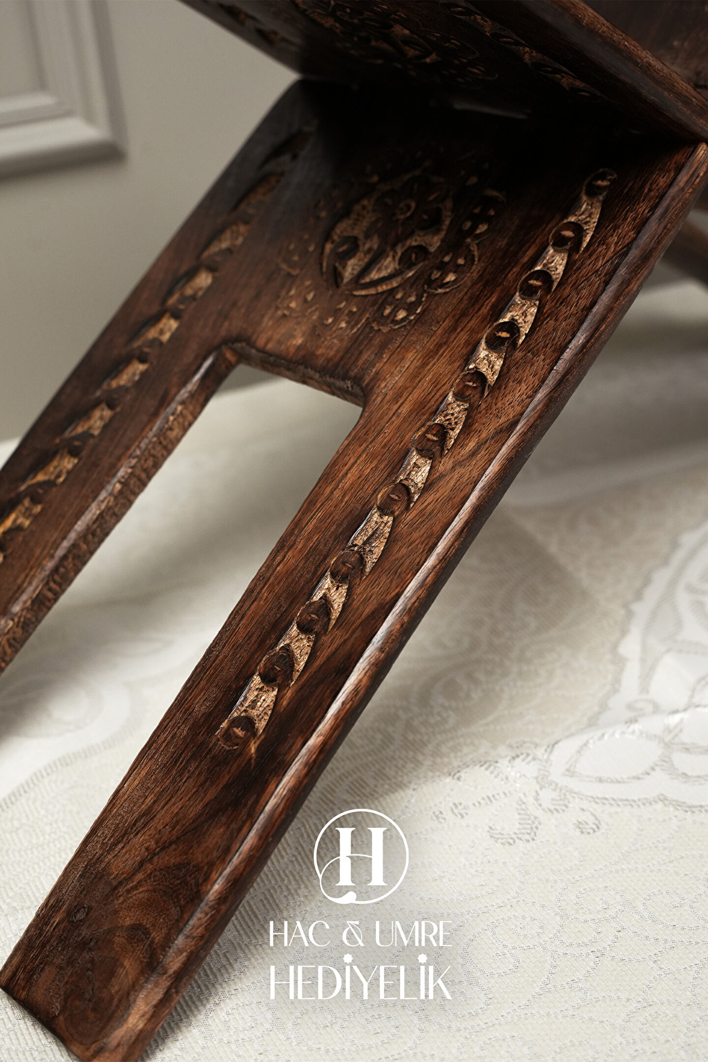 Hac Umre Hediyelik Rahle El Yapımı Masif Ahşap | Desenli Kulplu Kitap Okuma Standı | Küçük Boy Kuran Rahlesi