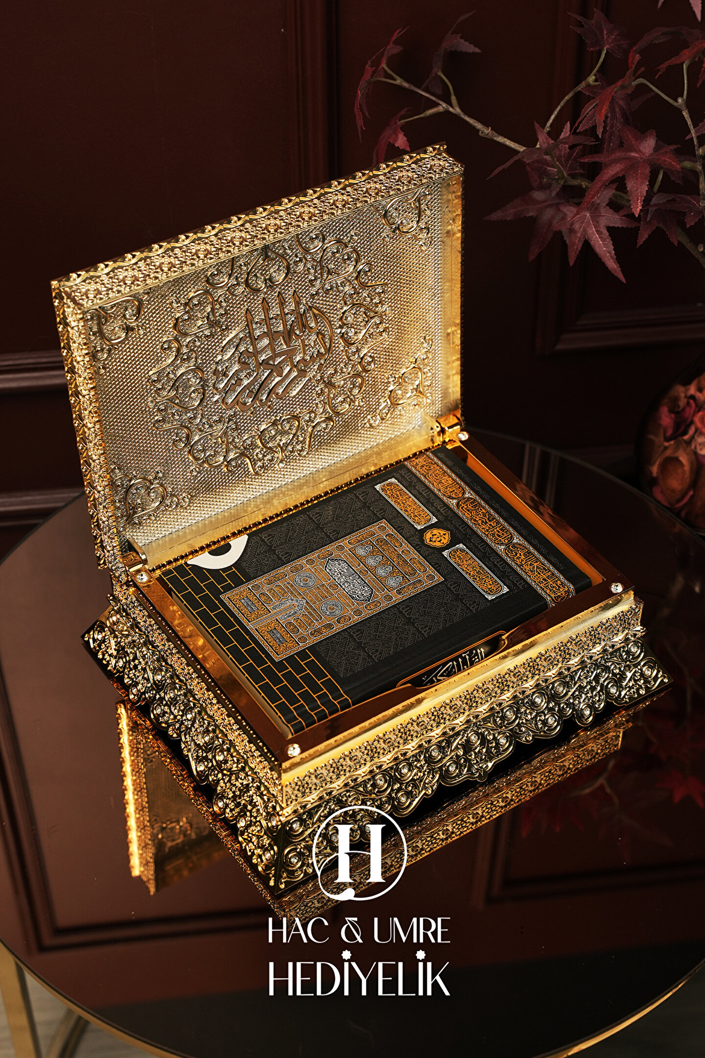 ✨ Lüks Kabartmalı Sandıklı Kuran Kabı ve Hediyelik Kabe Kapaklı Kur'an-ı Kerim Seti