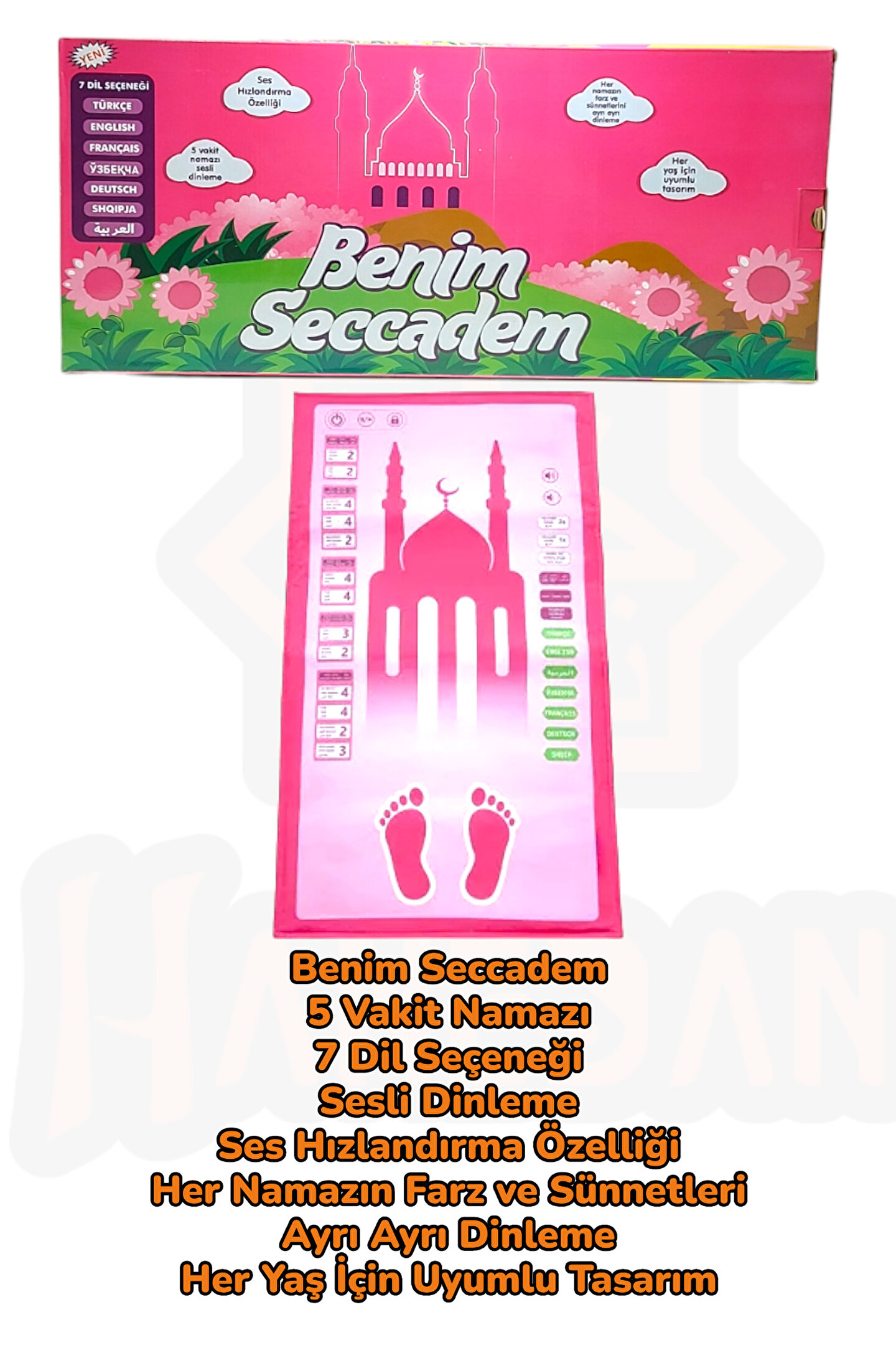 Polyester materyal kullanımı sayesinde uzun ömürlü ve dayanıklı bir yapıya sahiptir; Lateks taban özelliği ile kaymazlık ve konforlu bir ibadet deneyimi sunar; Polyster materyal bileşeni, kolay temizlenebilirlik ve hijyenik bir kullanım sağlar; Nemli bezle silme özelliği, pratik ve hızlı temizlik imkanı tanır; Saçaksız (overlok) tasarımı ile modern ve sade bir görünüm sergiler;