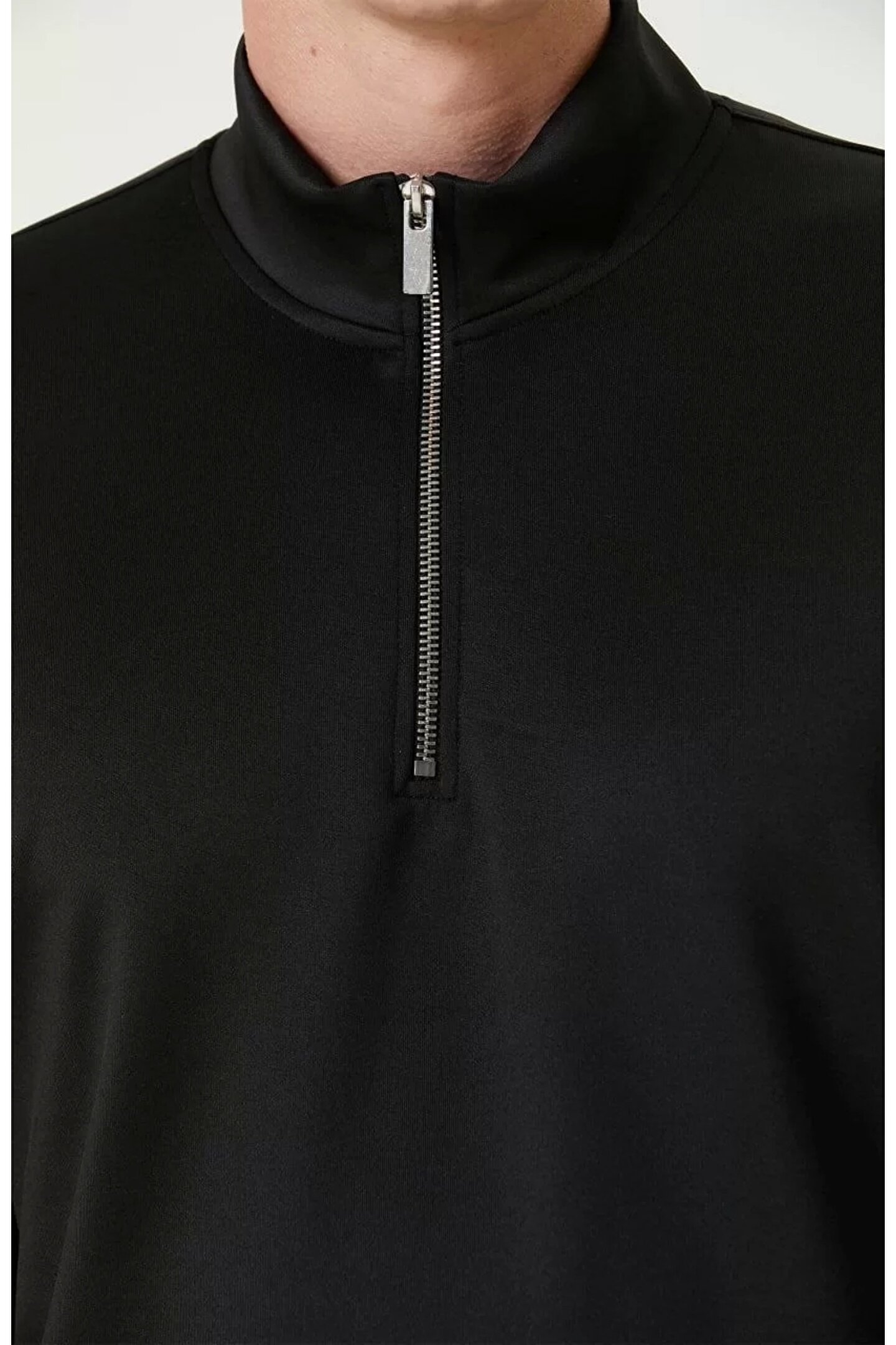 Unisex Uzun Kol Yarım Farmuarlı Yakalı Basic SweatShirt - Siyah