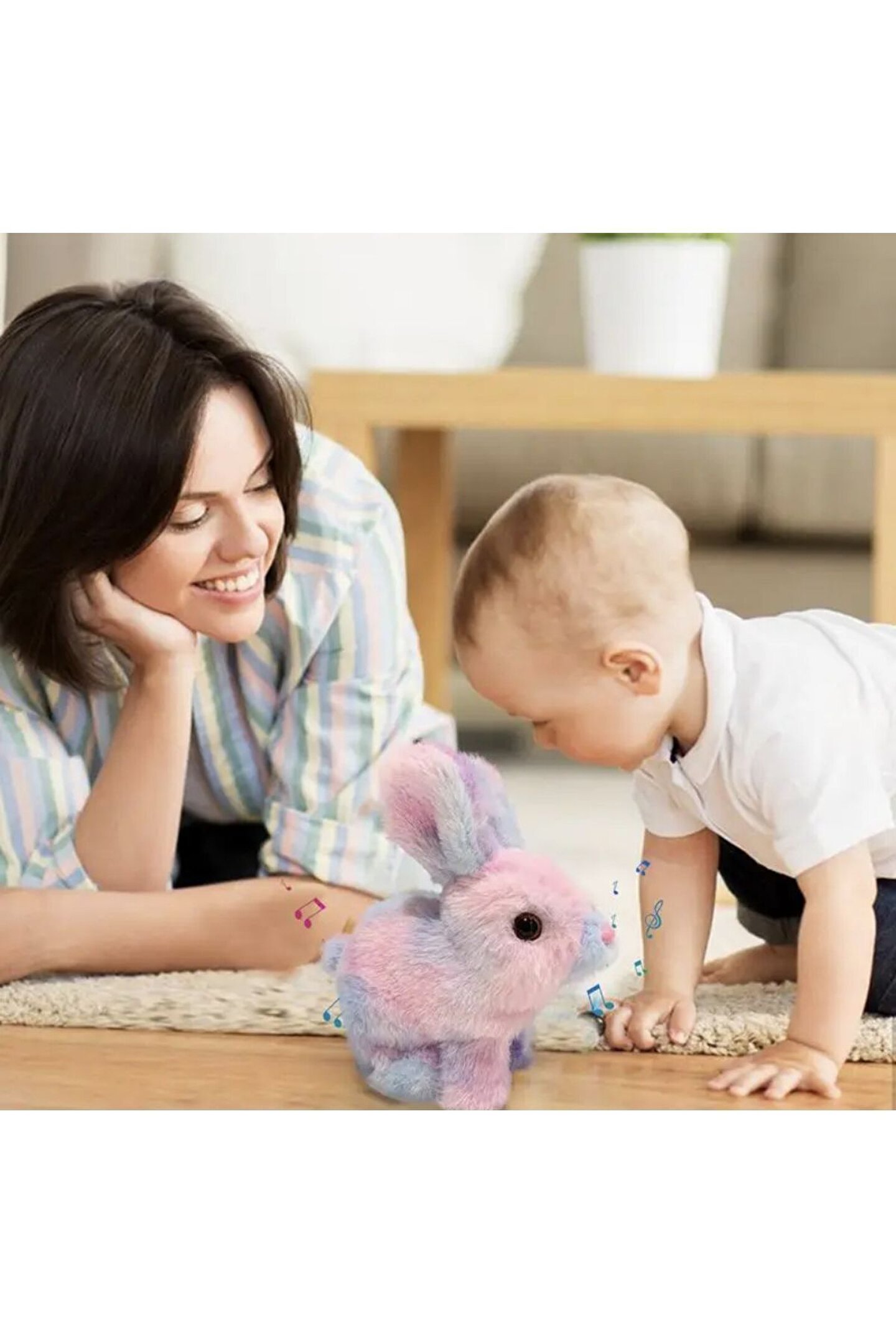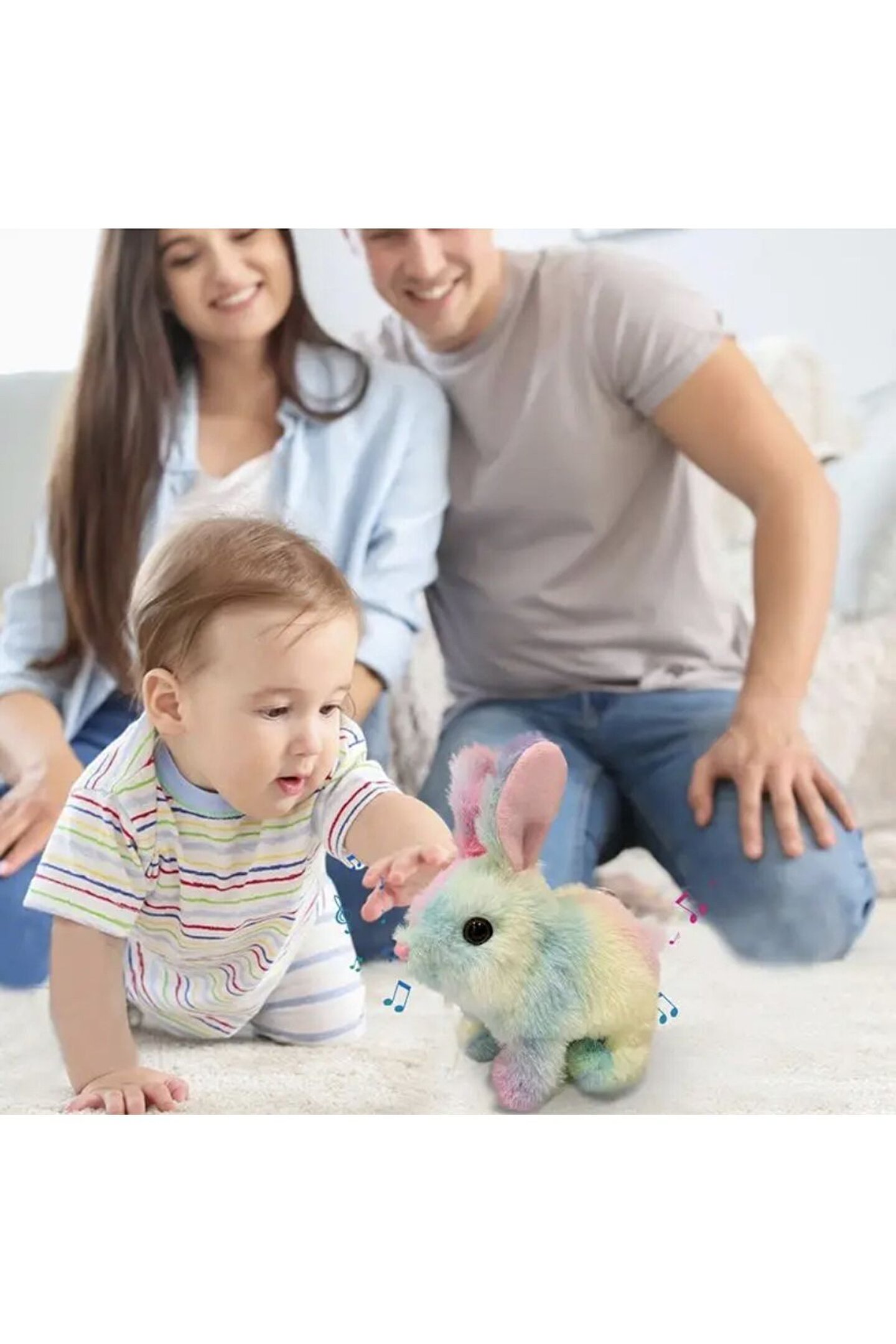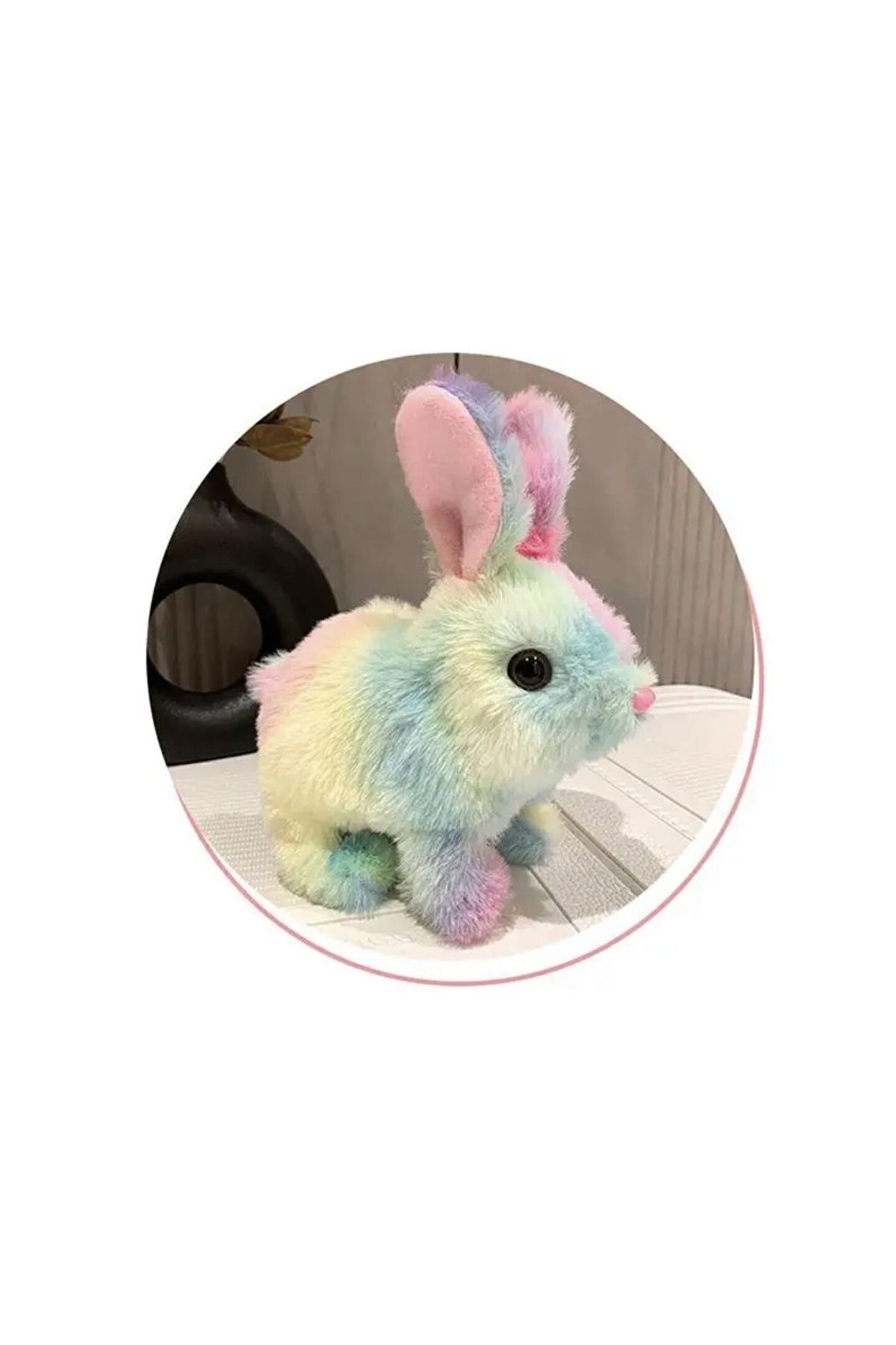 - 3 yaş ve üzeri çocuklar için ideal, sevimli gökkuşağı renkli tavşan tasarımı ile dikkat çeken peluş oyuncak; - 17 cm boyutuyla küçük eller için kolay tutuş ve oyun imkanı sunar; - Sesli ve hareketli özellikleri sayesinde çocukların ilgisini çeker, eğlenceli vakit geçirmelerini sağlar; - Yumuşak dokusuyla çocukların güvenle oynayabileceği, konforlu bir oyuncak deneyimi sunar;