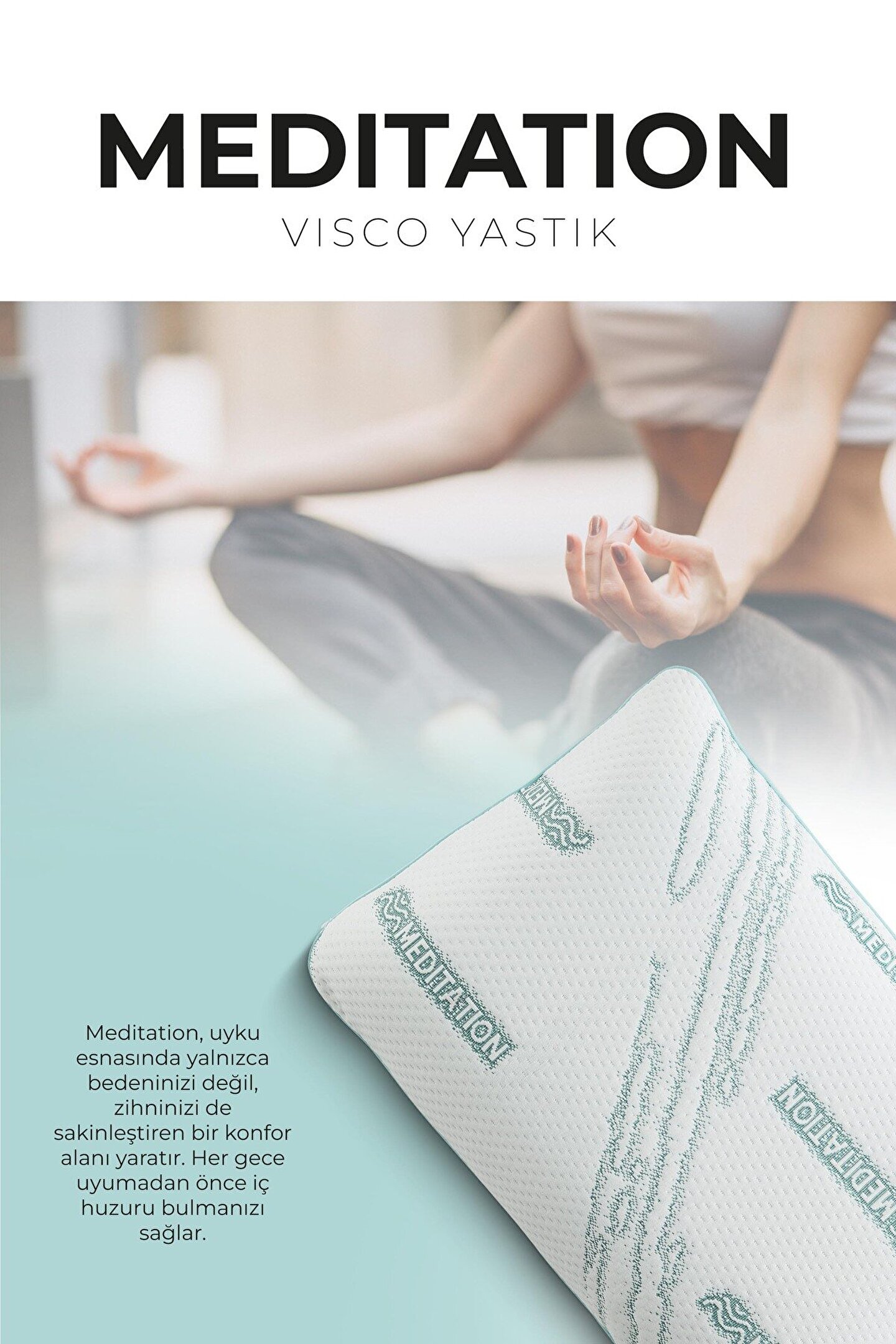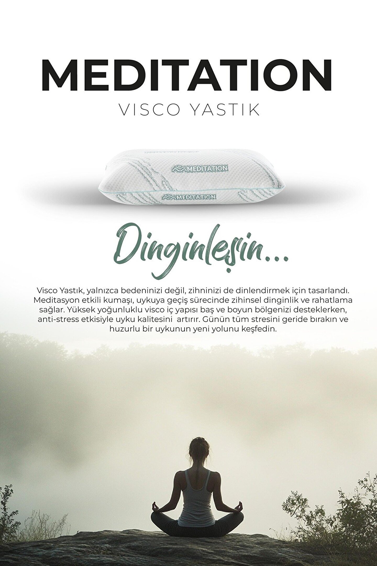 Meditation Kumaşı, uyku sırasında vücuttaki statik elektriği azaltarak kasları gevşeten, stresi düşüren ve zihinsel–duygusal yenilenmeyi destekleyen özel bir teknolojidir.; Daha derin ve kaliteli uykuya yardımcı olur, kas yorgunluğunu azaltır ve negatif enerjiden arınma hissi sağlar.; Özellikle yastık ve uyku ürünlerinde kullanıldığında, geceyi sadece dinlenme değil; bedensel, zihinsel ve ruhsal yenilenme sürecine dönüştürerek sabahları daha huzurlu, dinç ve enerjik uyanmayı destekler.;