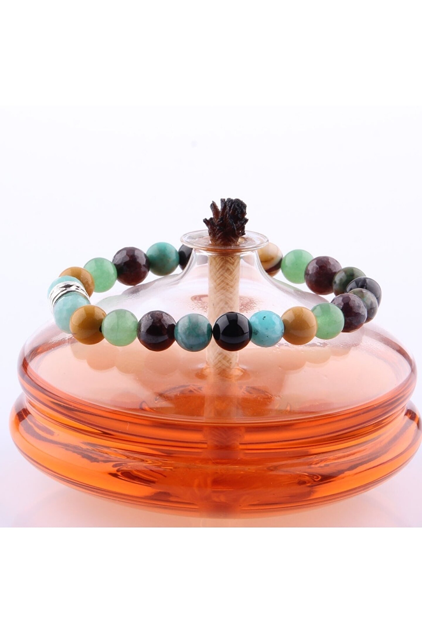 Bu doğal taş bileklik, Amazonit jasper, aventurin, lal amazonit ve akik gibi değerli taşların bir araya getirilmesiyle üretilmiştir; Her biri farklı enerjiler taşıyan bu taşlar, bileğe şık ve anlamlı bir aksesuar sunar; 8 mm boyutundaki boncuklarla tasarlanan bu bileklik, hem günlük kullanım hem de özel günlerde tercih edilebilir; Doğal taşların doğallığı ve estetiğiyle öne çıkan bu bileklik, benzersiz tasarımıyla dikkat çeker; ;;