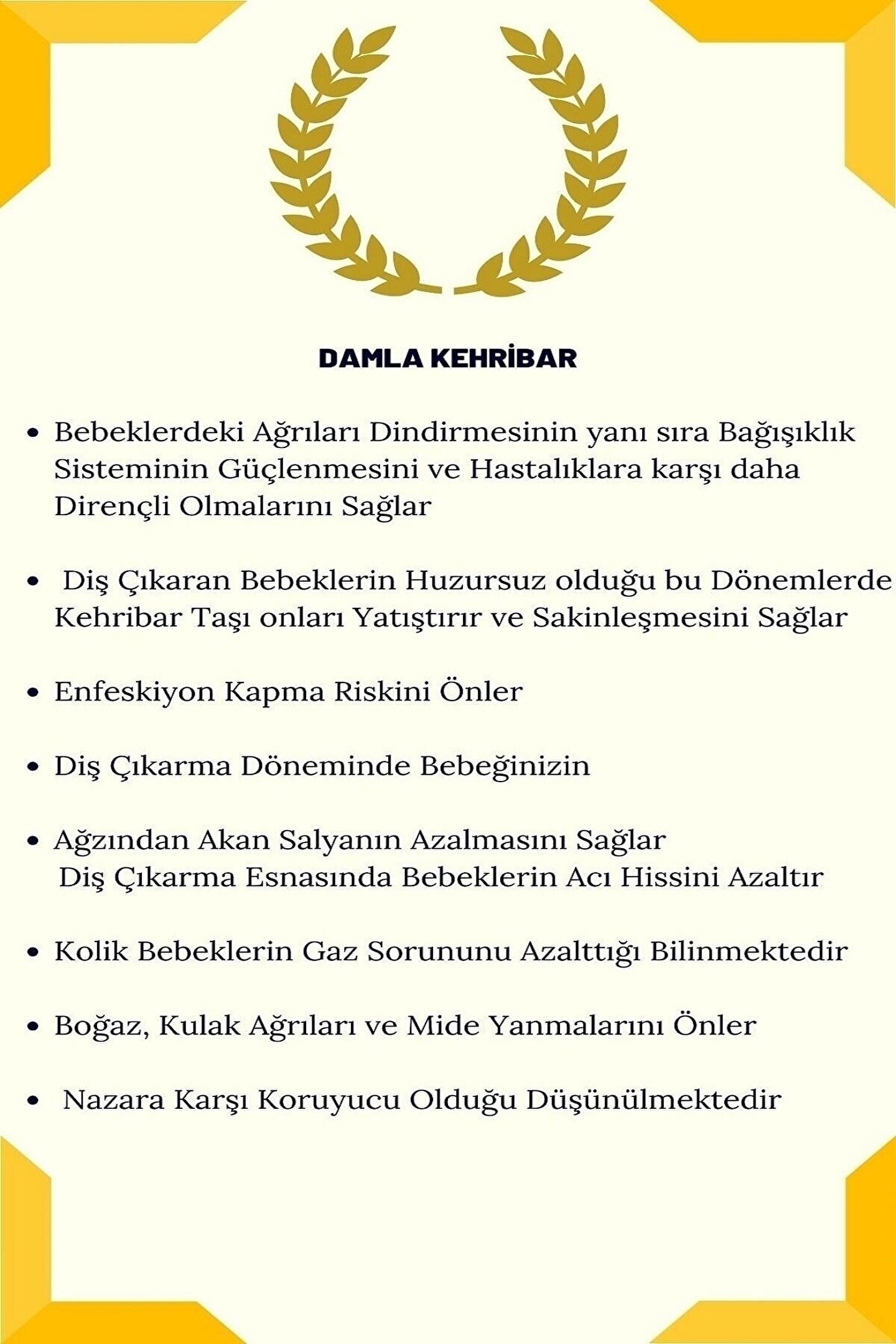 Bebeklerin diş çıkarma döneminde rahatlatıcı ve doğal bir seçenek sunan doğaltaş bebek ve çocuk damla kehribar kolye, miniklerin hassas cildine zarar vermeden rahatlama sağlar; Ateş düşürücü özelliği ile bebeklerin ateşli dönemlerinde de yardımcı olur, doğal bir çözüm sunar; Doğal taş kullanımı sayesinde her kolye benzersizdir ve her bebek için özel bir hediye olabilir;