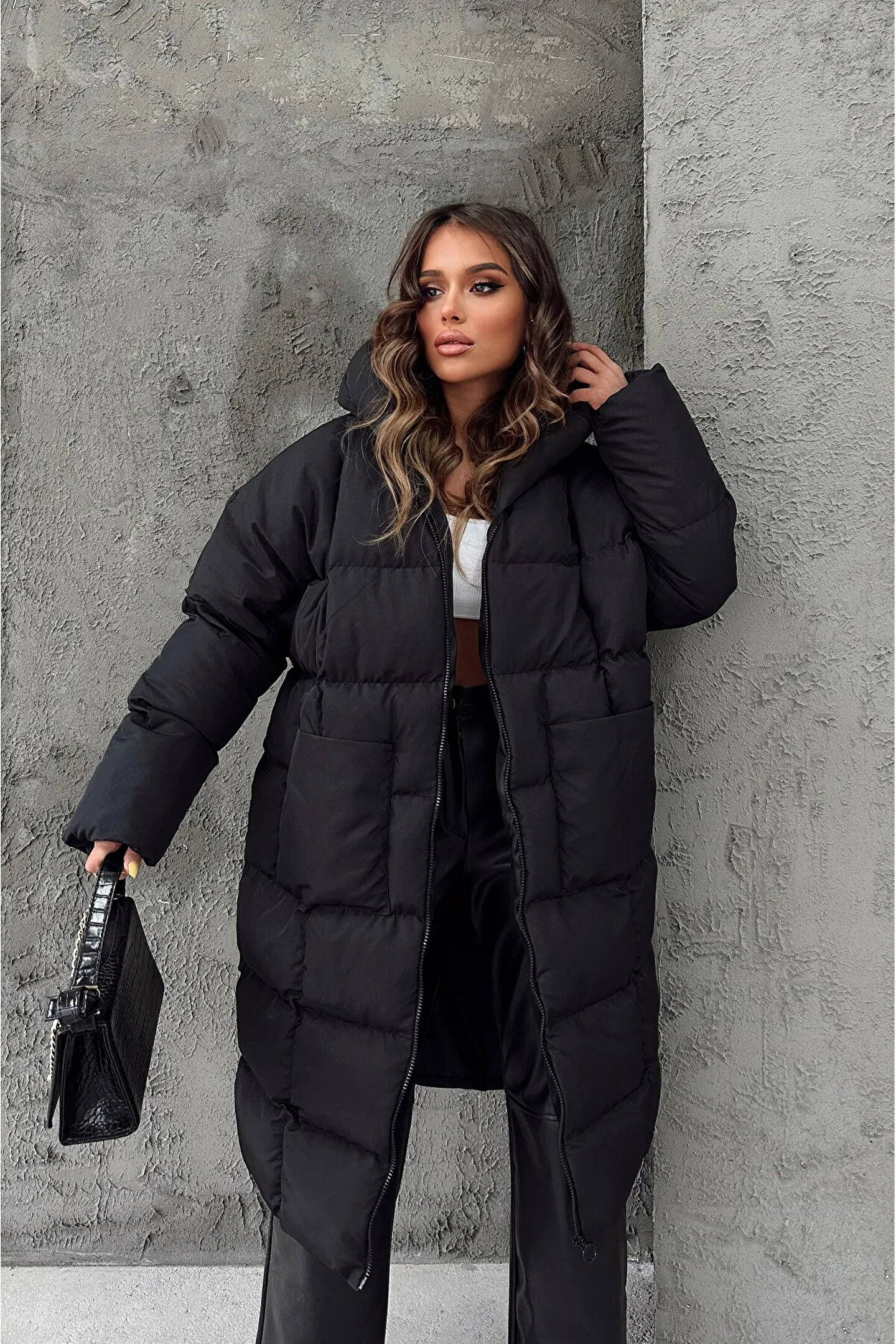 Hayat Boutique Kapüşonlu Uzun Oversize Şişme Kadın Mont - Siyah