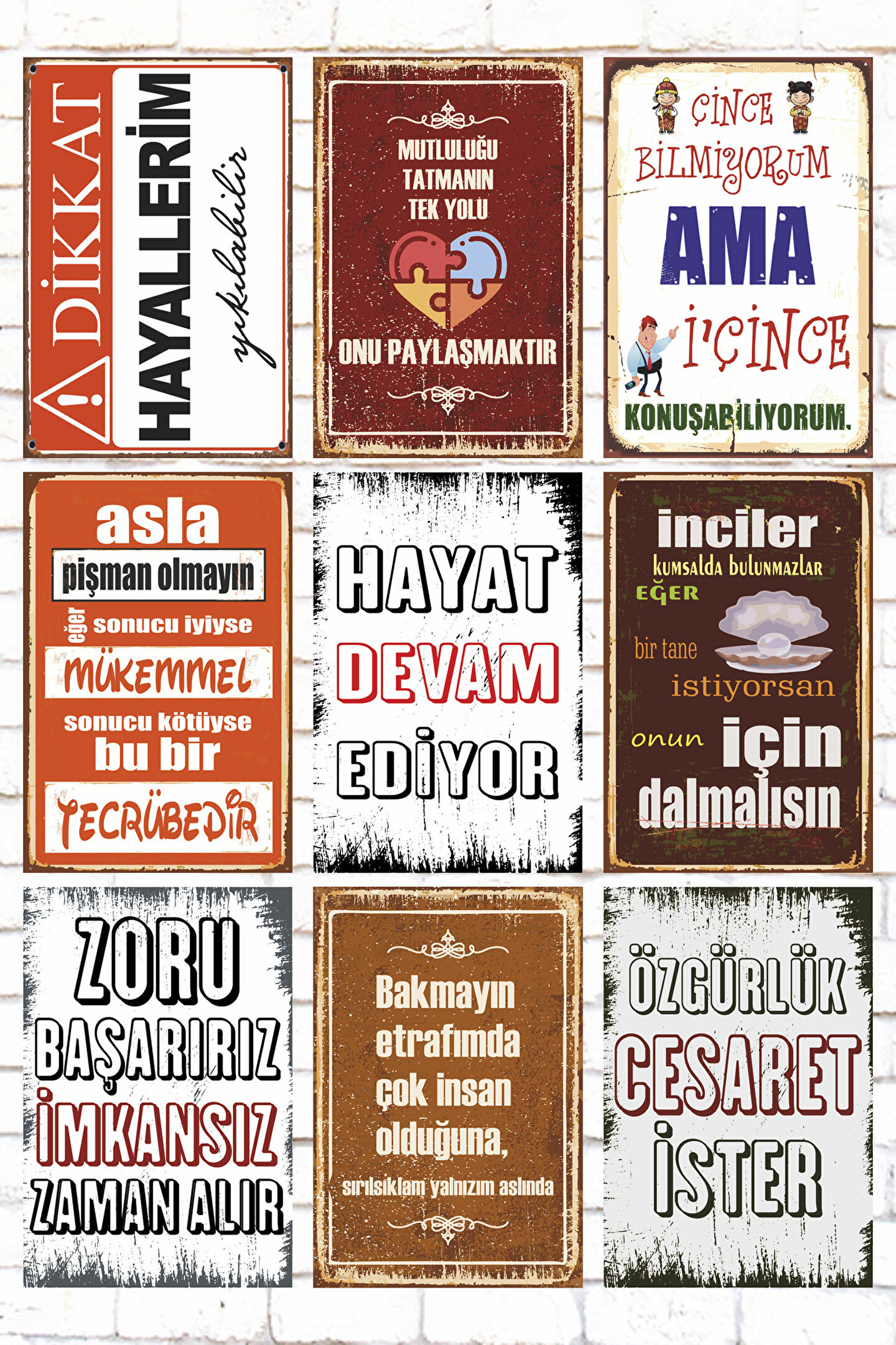 - Retro tarzıyla nostaljik bir atmosfer yaratan ahşap tablo seti, mekanınıza sıcaklık katar.- 9 farklı parçadan oluşan bu set, evinizin her köşesine uyum sağlayacak çeşitlilikteki tasarım seçenekleri sunar.- Çerçevesiz tasarımı sayesinde kolayca asılabilen ve istediğiniz şekilde düzenleyebileceğiniz bu tablolar, duvarlarınızda şık bir görünüm oluşturur.- Komik sözlerle süslenmiş bu duvar yazıları, mizah dolu anlar yaşamanızı sağlayarak yaşam alanlarınıza neşe katmayı vaat eder.