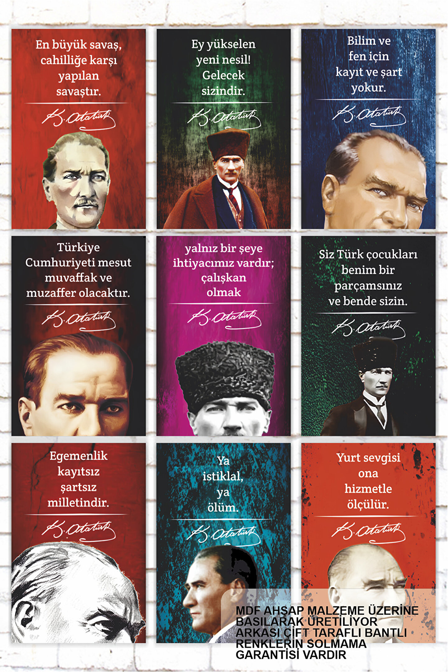 - 9 parçadan oluşan bu set, her biri ayrıntılı ve özgün tasarımıyla dikkat çeker.; - MDF malzemesi sayesinde uzun ömürlü kullanım sunar ve kolay temizlenebilir özelliğiyle pratiklik sağlar.; - Çerçevesiz tasarımı ile duvarlarınıza modern ve minimalist bir görünüm kazandırırken, mekanınıza şık bir dokunuş ekler.; - Retro tema ve stil anlayışıyla evinizin veya ofisinizin atmosferini zenginleştirirken, Atatürk'ün sözlerinin etkileyici mesajlarını yansıtır.; - Türkçe olarak sunulan bu set, Türk kültürünün önemli sembollerinden birini evinizde sergilemenize olanak tanır.