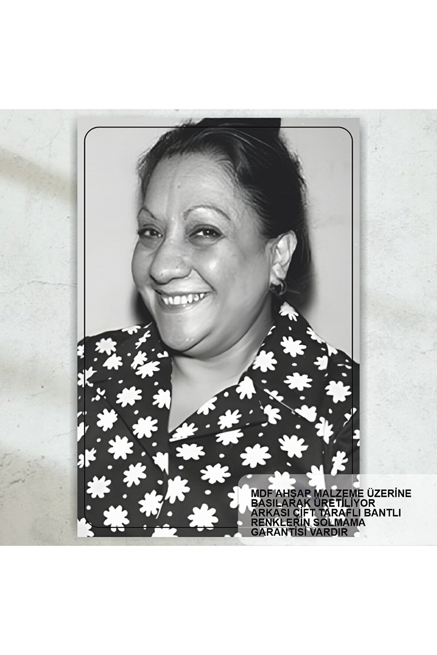 - Türk sinemasının efsanevi isimlerinden Adile Naşit'in yer aldığı bu retro ahşap poster, nostaljik bir dokunuşla mekanınıza hayat katıyor.; - Yüksek kaliteli MDF malzemeden üretilmiş olup, dayanıklılığı ve uzun ömürlü kullanımı ile ön plana çıkıyor.; - Tek parça halinde sunulan bu ürün, kolay montaj avantajıyla evinizin herhangi bir köşesine anında uyum sağlıyor.; - Çerçevesiz tasarımı sayesinde duvarlarınızda minimalist bir görünüm oluştururken, aynı zamanda dekoratif bir aksesuar olarak da işlev görüyor.; - Siyah-beyaz renk paletiyle klasik Türk filmlerinin ruhunu yansıtan bu tablo, retro tarzınızı tamamlamanız için idealdir.