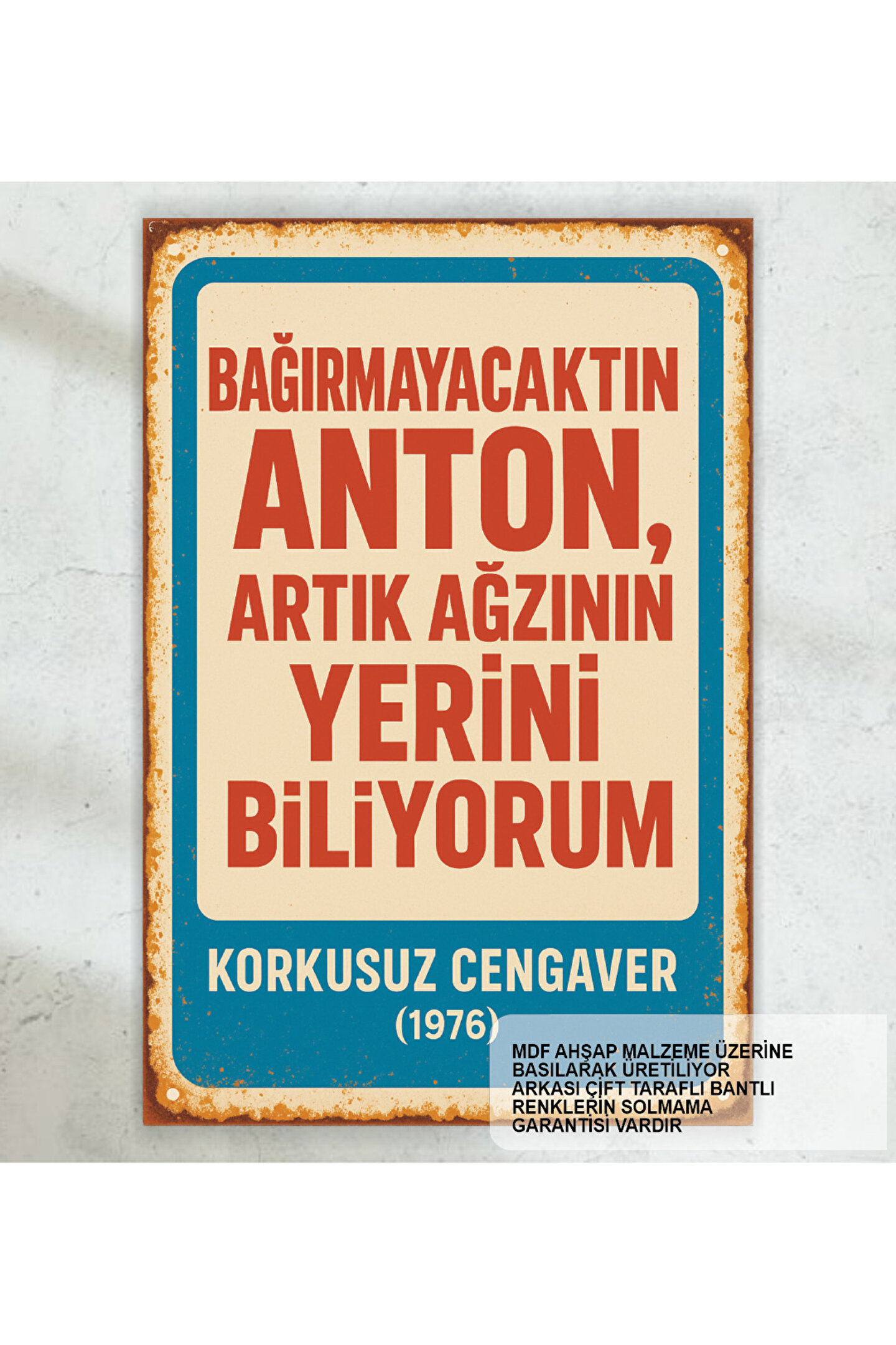 - Anton Cüneyt Arkın'ın unutulmaz Yeşilçam repliklerini içeren bu retro ahşap poster, evinizin dekorasyonuna nostaljik bir dokunuş katıyor.; - Tek parça halinde gelen bu ürün, kolay montaj avantajı sunarak zaman kazandırırken, mekanınıza modern bir hava katıyor.; - Dayanıklı MDF malzemesinden üretilmiş olup, uzun ömürlü kullanım vaat ediyor.; - Çerçevesiz tasarımı sayesinde duvarınızda minimalist ve şık bir görünüm sağlıyor; istediğiniz herhangi bir alanda rahatlıkla sergilenebilir.; - "Bağırmayacaktın" gibi ikonik repliklerle süslenmiş bu poster, Yeşilçam sinemasının özünü yansıtarak film tutkunlarının beğenisine hitap ediyor.