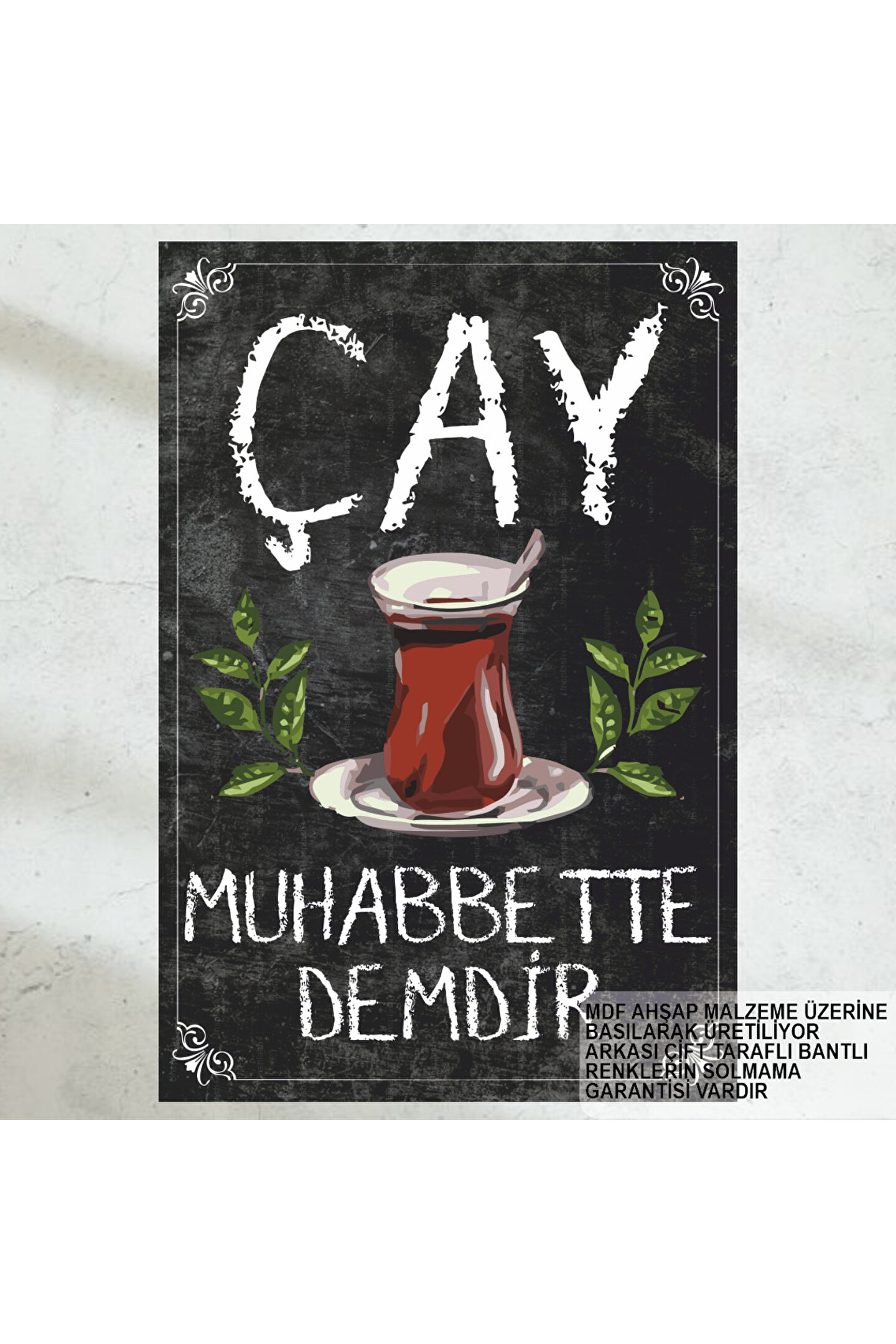 - Retro tasarımıyla dikkat çeken bu çay sözleri tablosu, evinizin veya kafenizin atmosferini zenginleştirir.; - Tek parça halinde sunulan bu ürün, kolay montaj avantajı sağlar ve ekstra çerçeve ihtiyacını ortadan kaldırır.; - Yüksek kaliteli MDF malzemesinden üretilmiş olup, uzun ömürlü kullanım vaat eder.; - Türkiye'de üretilen bu ürün, yerel kaynakların desteklenmesine katkıda bulunurken aynı zamanda estetik bir dokunuş sunar.; - Çerçevesiz tasarımı sayesinde duvarınızda daha modern ve minimalist bir görünüm elde etmenizi sağlar.