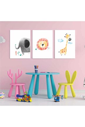 Çocuk odalarına doğal bir dokunuş katan ahşap tablo seti, hem dayanıklı hem de estetik bir görünüm sunar; Safari hayvanları temalı bu üç parçalık set, çocukların hayal dünyasını genişletir ve odalarına eğlenceli bir atmosfer katar; Fil, aslan ve zürafa figürleriyle süslenmiş bu tablolar, çocukların odalarına renkli ve canlı bir hava katarken aynı zamanda eğitici bir etki sağlar; Ahşap malzemesi sayesinde uzun ömürlü kullanım sunar ve çocukların odalarında yıllar boyu keyifle kullanabilecekleri bir dekoratif obje haline gelir;