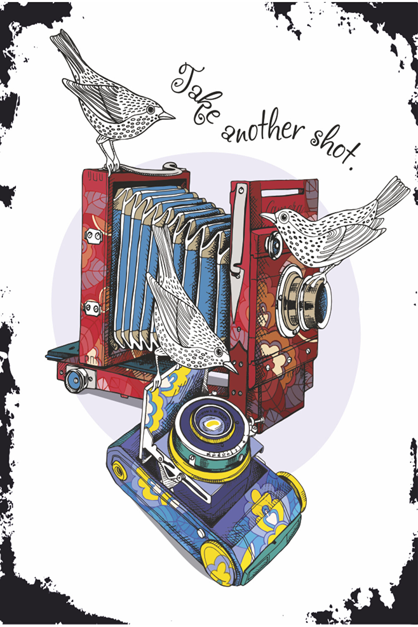 Hayat Poster eski fotoğraf kamerası makinesi ve kuşlar vintage tarz retro ahşap poster