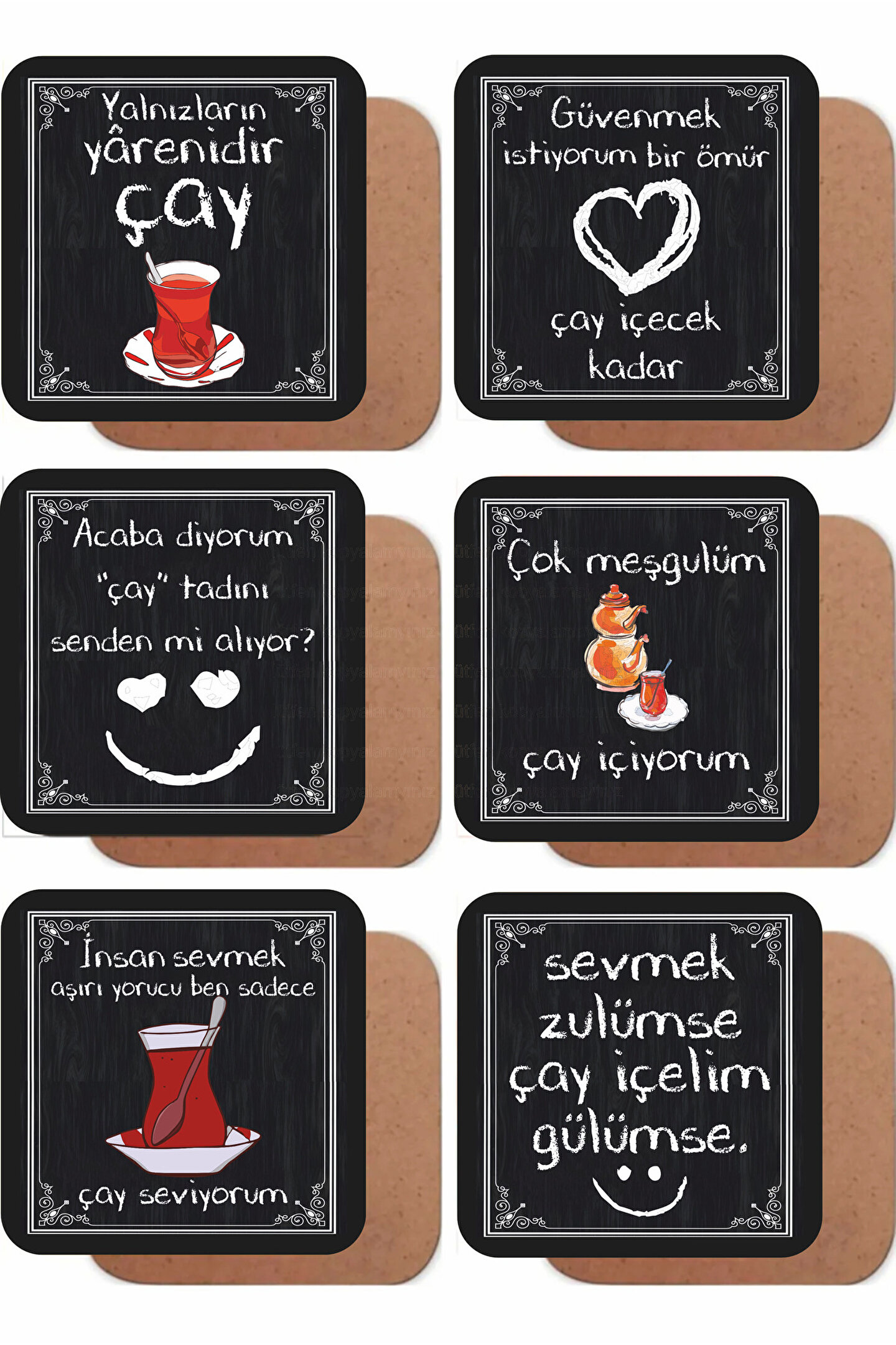 - Ev, mutfak veya kafe gibi alanlarda kullanabileceğiniz bu 6'lı ahşap bardak altlıkları, sıcak çayınızı keyifle yudumlayacağınız şık bir atmosfer oluşturur.; - MDF malzemesinden üretilmiş olup, dayanıklılığı ve uzun ömürlü kullanımı ile ön plana çıkar.; - Her bir parça kare şeklindedir; bu sayede farklı boyutlardaki fincanlarınız için ideal uyumu sağlar.; - Üretiminde yerli kaynakların tercih edilmesiyle hem çevre dostu hem de ekonomik bir seçenek sunar.; - Sevdiklerinize özel günlerde hediye olarak da düşünebileceğiniz bu set, onların mutfağınıza hoş bir dokunuş katacaktır.
