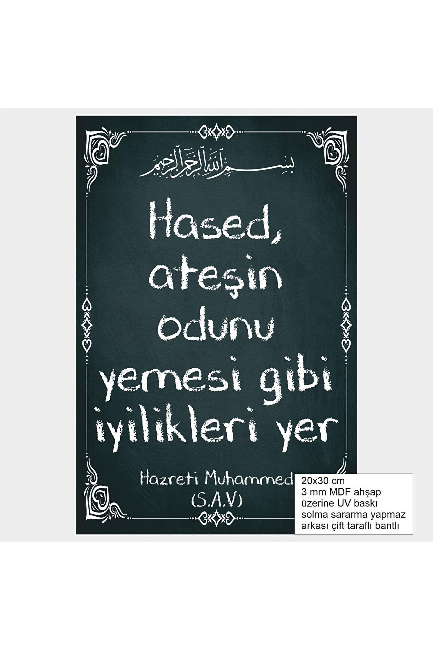 20x30 cm 3 mm MDF ahşap üzerine UV baskı solma sararma yapmaz arkası çift taraflı bantlı Manevi ve dini temalı tasarımıyla, İslam kültürüne dair derin anlamlar taşıyan bir dekorasyon öğesi.; - Hz.; Muhammed'in hadislerini ve sözlerini yansıtan, inançlarınızı ve değerlerinizi evinizin her köşesine taşıyan bir sanat eseri.; - Türkiye'de üretilmiş olup, yerel sanatçılarımızın özgün dokunuşlarını yansıtan bir ürün.; - Çerçevesiz tasarımı sayesinde, kişisel zevkinize göre farklı çerçeve seçenekleriyle kombin yapma imkanı sunar.; - MDF materyali ile dayanıklılığı ve uzun ömürlü kullanımı garanti ederken, modern ve şık bir görünüm sağlar.;