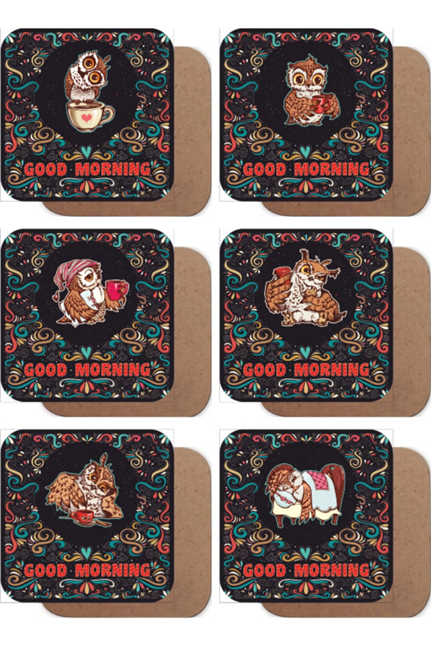 Ahşap malzeme kullanımı sayesinde doğal ve sıcak bir dokunuş sunar; Sevimli baykuş figürleriyle kahve keyfinizi renklendirir ve masanızda şık bir aksesuar oluşturur; 6 adet bardak altlığı seti, birden fazla kişiye aynı anda hizmet vermenizi sağlar; Dayanıklı yapısı ile uzun süreli kullanım için idealdir; sık kullanımda bile formunu korur;
