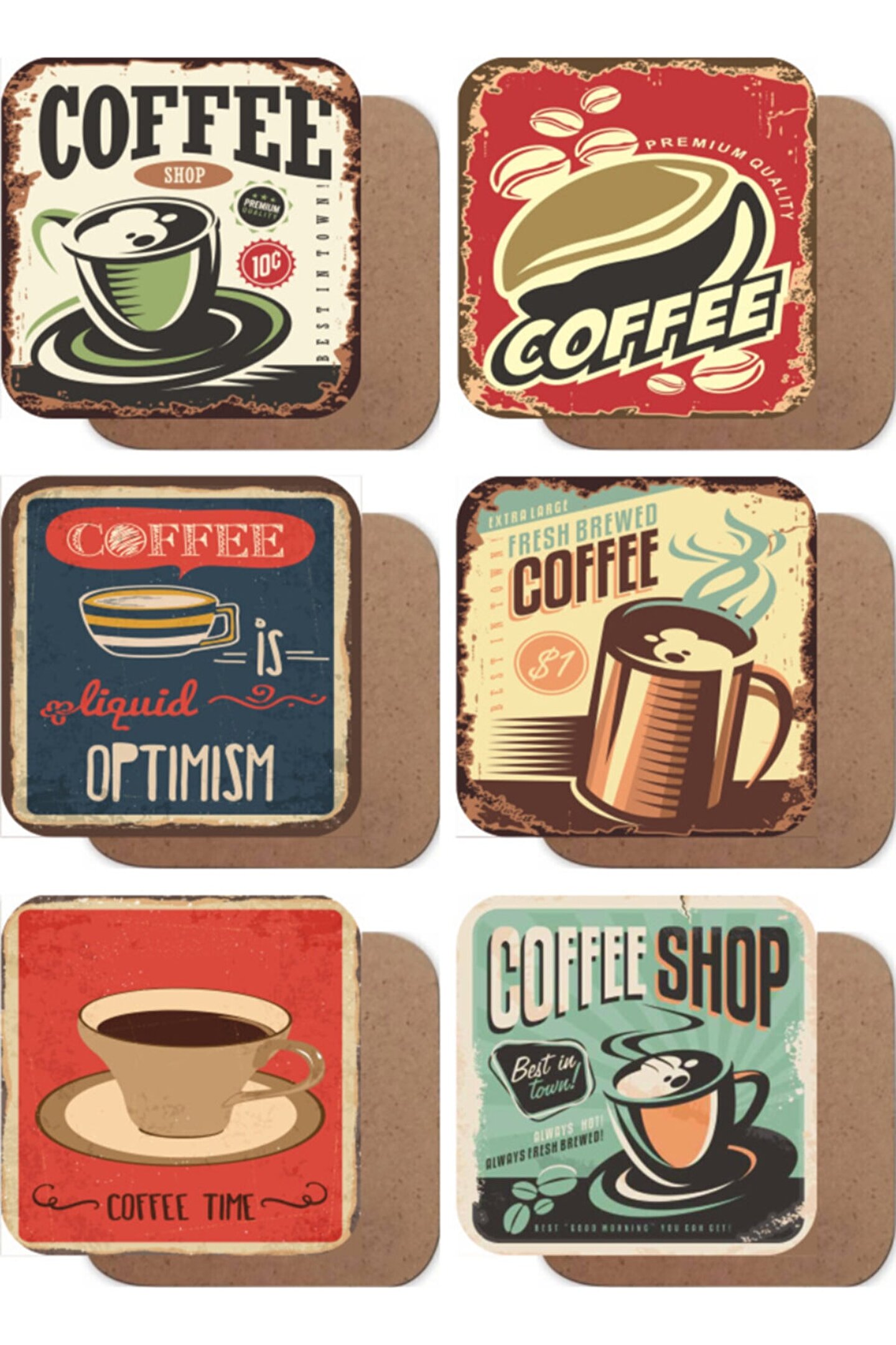 Hayat Poster Kahve Retro Vintage Tarz 6lı Ahşap Bardak Altlığı Seti