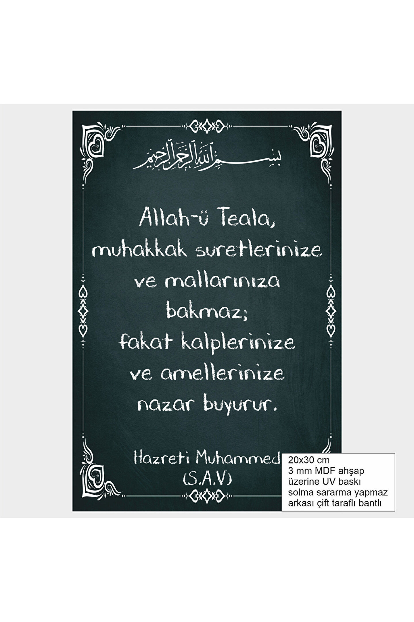 20x30 cm 3 mm MDF ahşap üzerine UV baskı solma sararma yapmaz arkası çift taraflı bantlı Manevi ve dini temalı tasarımıyla, Hz.; Muhammed hadislerini estetik bir şekilde sunan ahşap poster.; - Türkiye menşeli, yerel üretimle desteklenen kaliteli bir ürün.; - Çerçevesiz yapısı sayesinde, dekorasyonunuza kolayca uyum sağlar ve kişisel zevkinize göre çerçeve seçme özgürlüğü sunar.; - Dayanıklı MDF materyali ile uzun ömürlü kullanım vaat eder.;