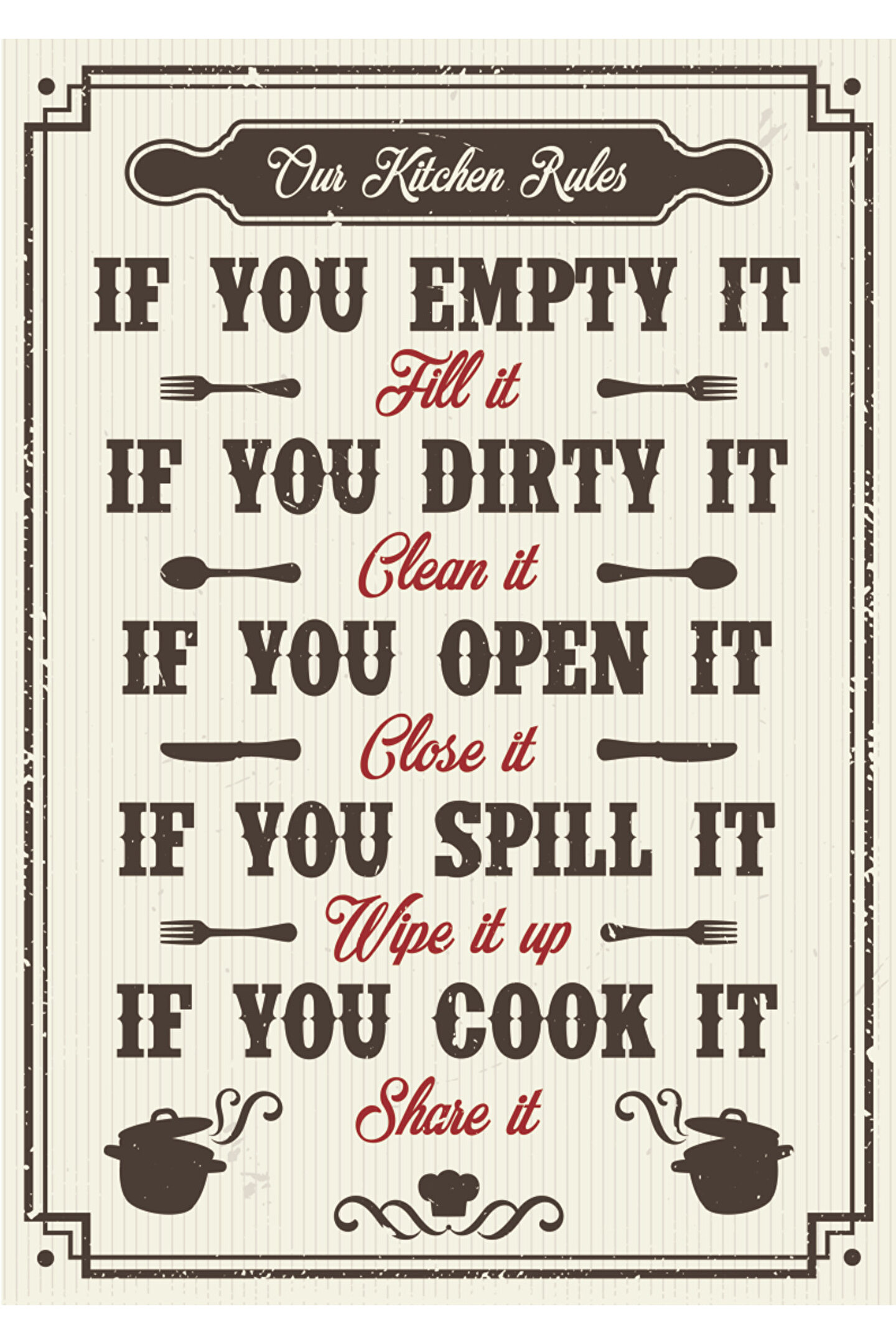 Tek parça halinde gelen bu mutfak kuralları tablosu, kolay montaj avantajı sunar ve mekanınıza şık bir dokunuş katar; Retro tasarımı ile nostaljik bir atmosfer yaratırken, evinizin dekorasyonuna otantik bir hava katmak için idealdir; Doğal ahşap materyali sayesinde dayanıklılık ve uzun ömürlü kullanım vaat eder;