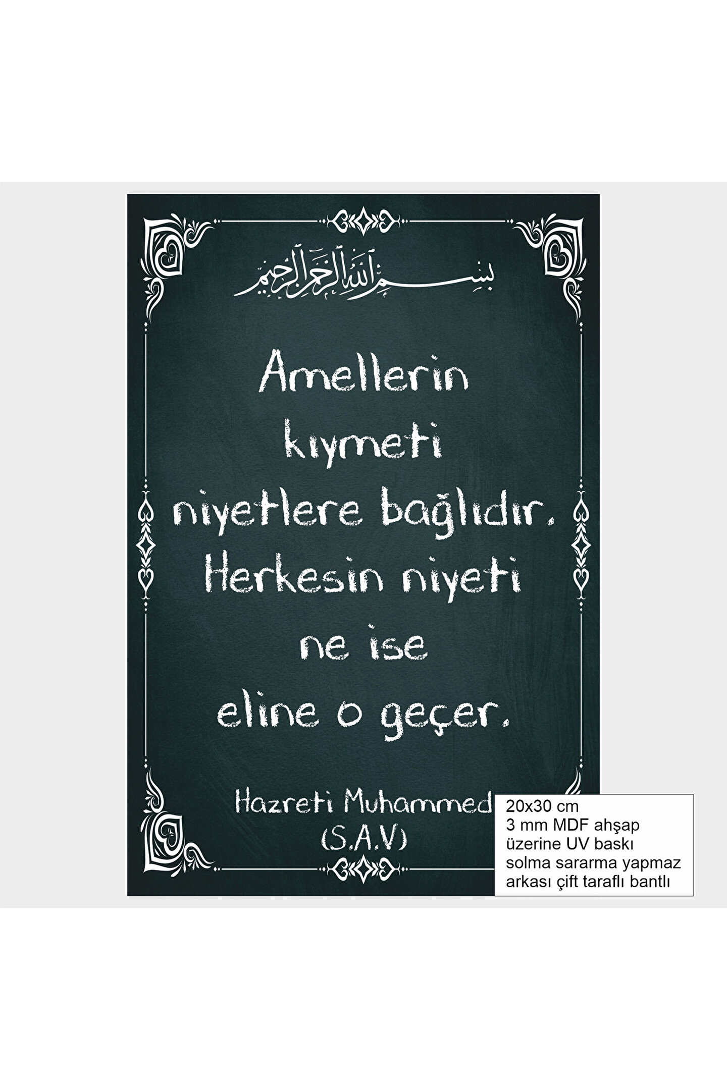 20x30 cm 3 mm MDF ahşap üzerine UV baskı solma sararma yapmaz arkası çift taraflı bantlı Hz.; Muhammed'in niyet hadislerinden oluşan bu dini tablo, manevi ve dini temayı yansıtan bir tasarıma sahiptir.; - Türkiye'de üretilmiş olan bu poster, yerel sanatçılarımızın el emeğiyle hazırlanmıştır.; - Çerçevesiz tasarımı sayesinde, farklı çerçeve seçenekleriyle kolayca kişiselleştirilebilir.; - MDF materyali ile üretilmiş olup, dayanıklılığı ve uzun ömürlü kullanımı garanti eder.;