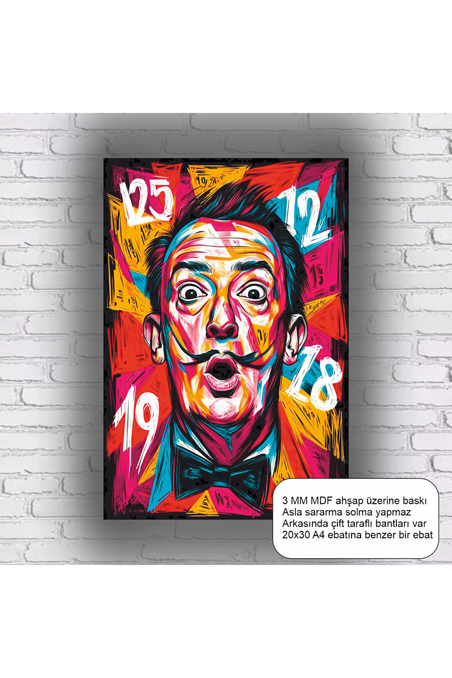 - Salvador Dali'nin ikonik ressam figürünü yansıtan popart tasarımı, sanatseverlerin beğenisine sunuluyor.; - Retro ve eğlenceli bir atmosfer yaratmak isteyenler için ideal, komik ve dikkat çekici bir duvar dekorasyonu.; - MDF malzemesi sayesinde dayanıklı ve uzun ömürlü kullanım sunar; evinizin her köşesine kolayca asılabilir.; - Çerçevesiz tasarımı ile farklı çerçeve seçenekleriyle kişiselleştirme imkanı sağlar; mekanınıza uygun bir stil oluşturmanıza olanak tanır.; - Türkiye menşeli olup, yerel üretimle desteklenmiş kaliteli bir üründür.;