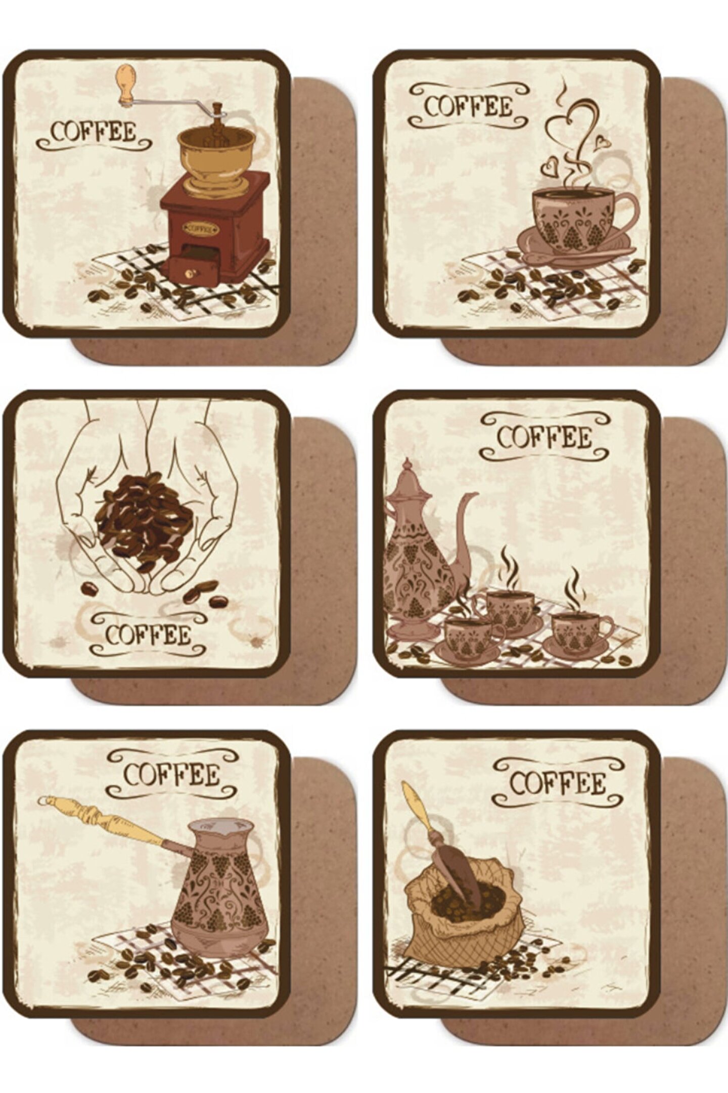 Hayat Poster Türk Kahvesi Ve Kahve Çekirdeği Değirmeni 6lı Retro Ahşap Bardak Altlığı Seti