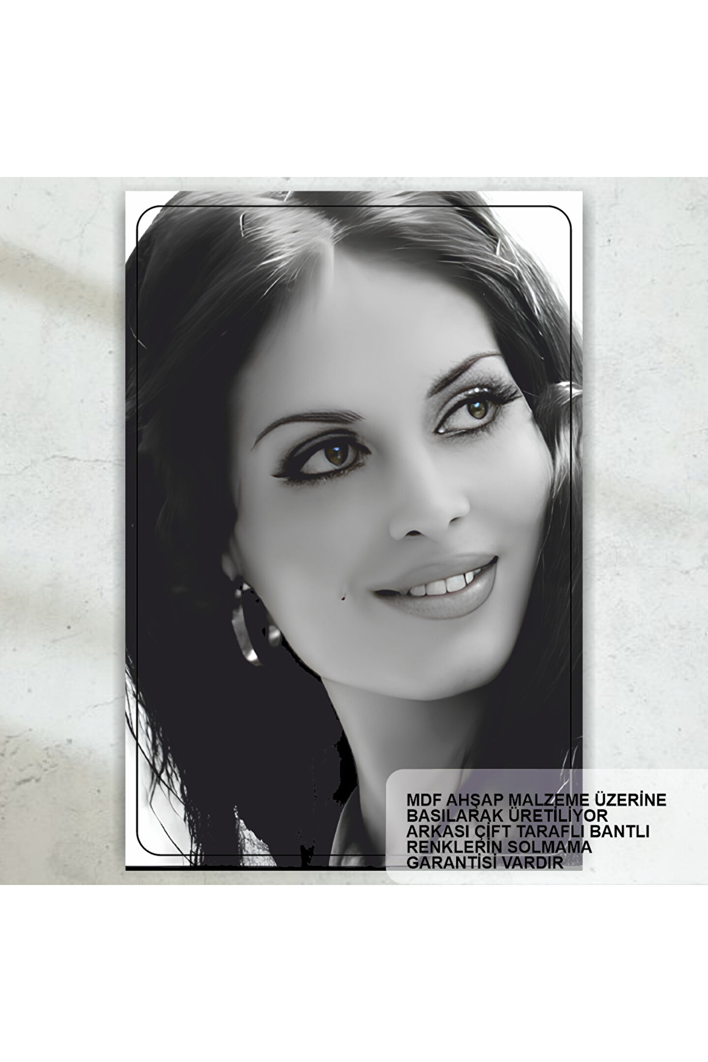 - Türk sinemasının efsane ismi Türkan Şoray'ın Yeşilçam'daki unutulmaz performanslarını yansıtan retro ahşap poster, nostaljik bir dokunuşla mekanınıza hayat katıyor.; - Yüksek kaliteli MDF malzemesinden üretilmiş bu tablo, dayanıklılığı ve uzun ömürlü kullanımı ile dikkat çekiyor.; - Tek parça halinde gelen bu ürün, kolay montaj avantajı sunarak zaman kazandırırken, dekorasyonunuza modern bir hava katıyor.; - Çerçevesiz tasarımı sayesinde duvarınızda daha az yer kaplayarak, diğer sanatsal eserlerinizle uyum içinde olacak şekilde özgürce sergilenebilir.