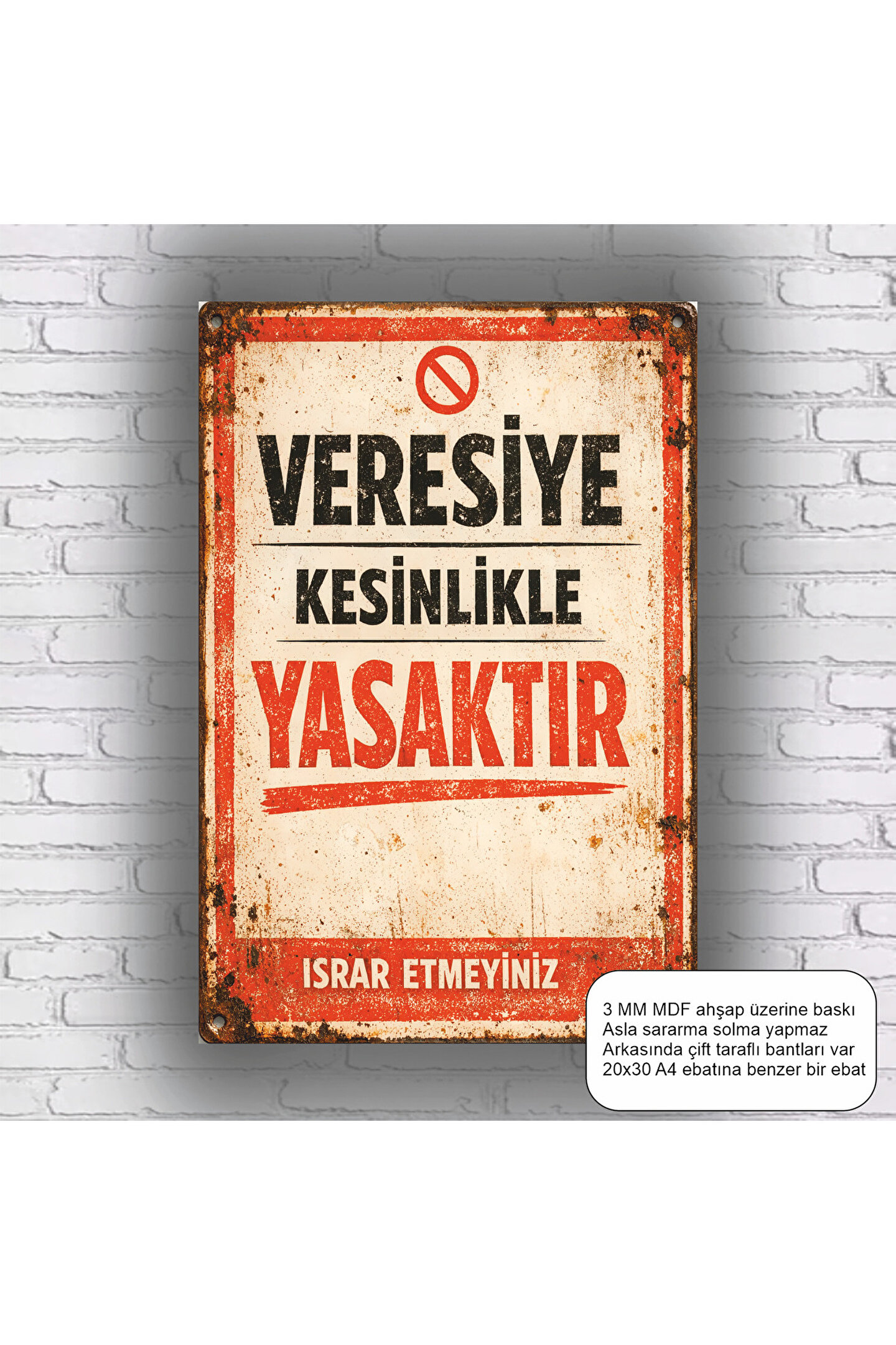 - Nostaljik ve eğlenceli bir dekorasyon aracı olan bu retro ahşap poster, mekanınıza özgün bir hava katacak.; - "Veresiye Yasaktır" sloganı ile esnaf uyarı levhası olarak tasarlanmış, hem iş yerinizde hem de evinizde kullanabileceğiniz komik ve esprili bir ürün.; - Yüksek kaliteli MDF malzemeden üretilmiş olup, uzun ömürlü ve dayanıklı bir kullanım sunar.; - Çerçevesiz tasarımı sayesinde, istediğiniz çerçeve ile kolayca kombinleyebilir ve kişisel zevkinize göre şekillendirebilirsiniz.; - Türkiye'de üretilmiş olmasıyla yerel üretimi desteklerken, kaliteli işçiliğin bir göstergesi olarak öne çıkar.;