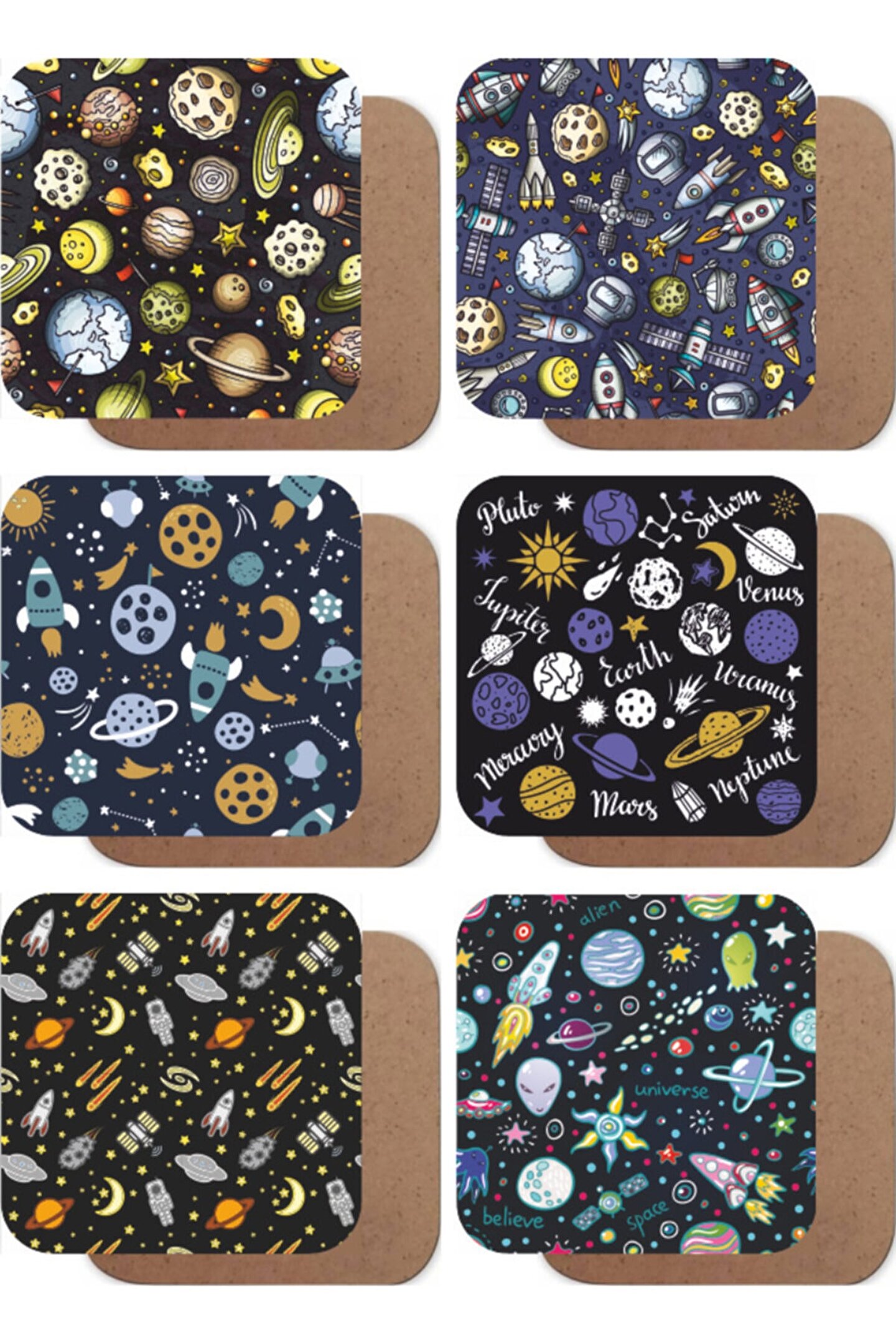 - Uzay temalı tasarımıyla dikkat çeken bu bardak altlıkları, evinizdeki kahve veya çay ritüellerinize yıldız tozu serpintileri ekler; - Doğal ahşap malzemesiyle hem dayanıklı hem de estetik bir görünüm sunar, uzun süreli kullanım için idealdir; - Her bir bardak altlığı, yıldız ve gezegen figürleriyle süslenmiş olup, masanızda görsel bir şölen yaratır; - 6 adet bardak altlığı seti ile misafirlerinize uzay temalı bir deneyim yaşatırken, aynı zamanda dekoratif bir dokunuş sağlar;