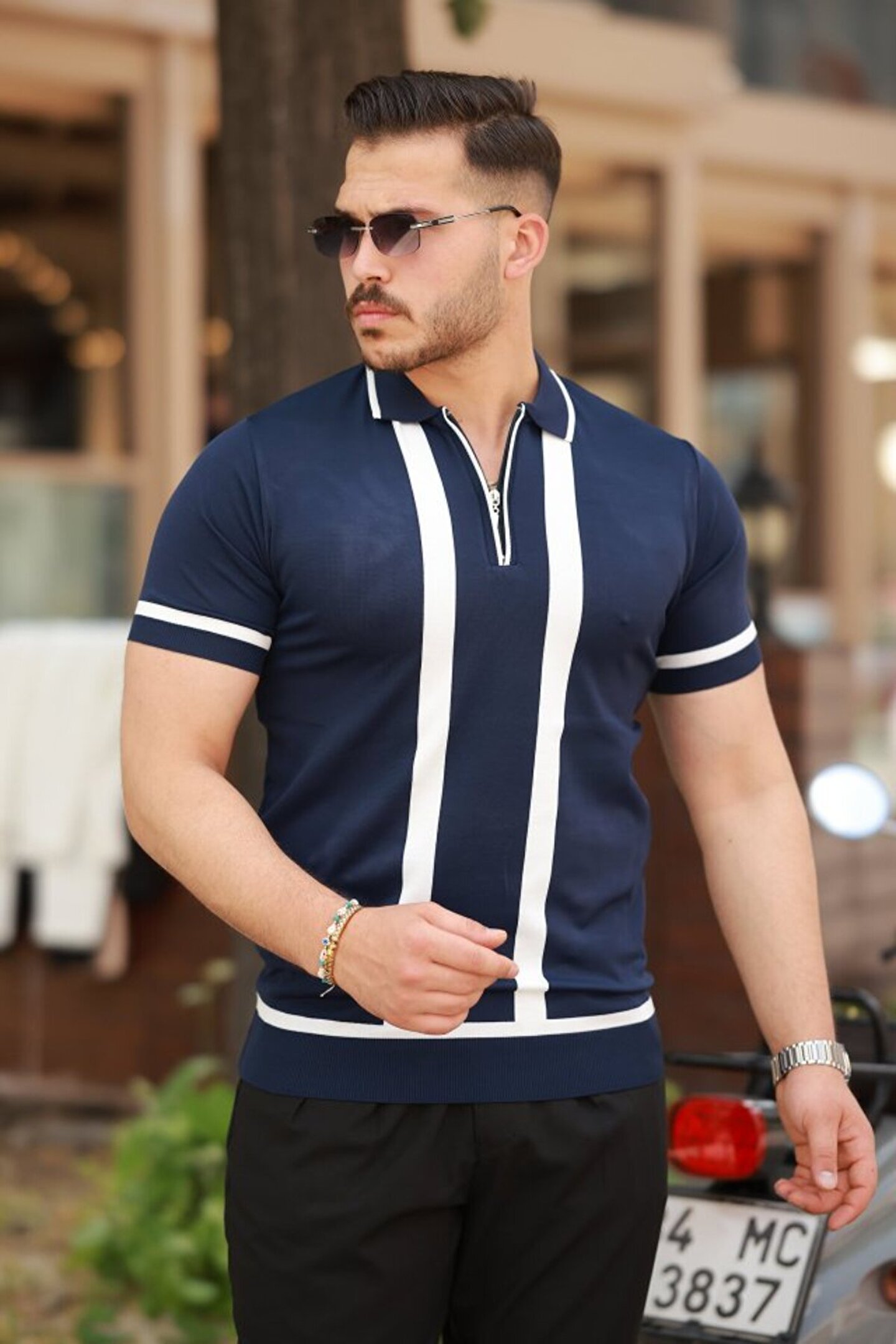 Erkek Fermuar Yakalı şerit Detaylı Kısa Kollu Tişört