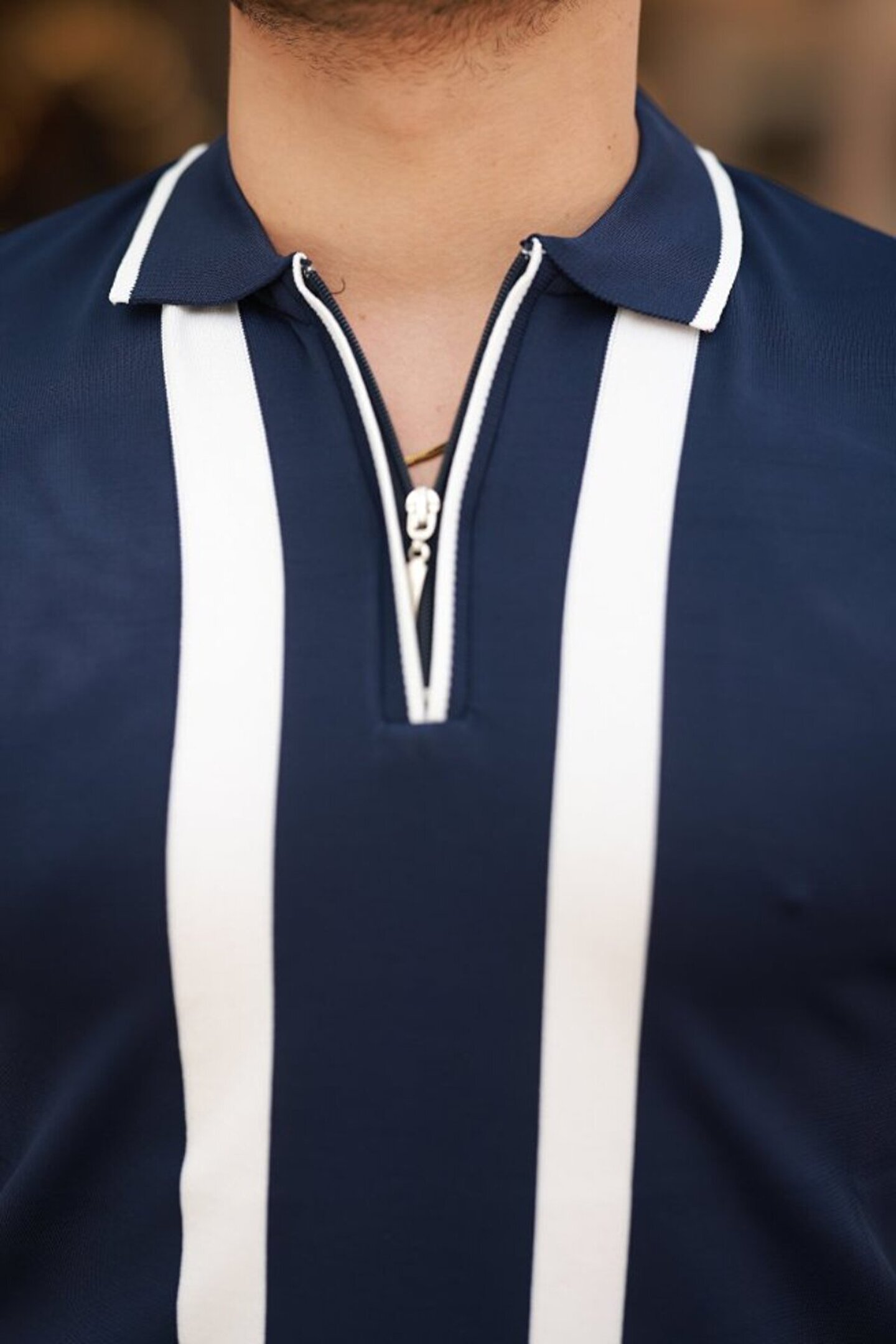 HAZEGO Erkek Fermuar Yakalı şerit Detaylı Kısa Kollu Tişört