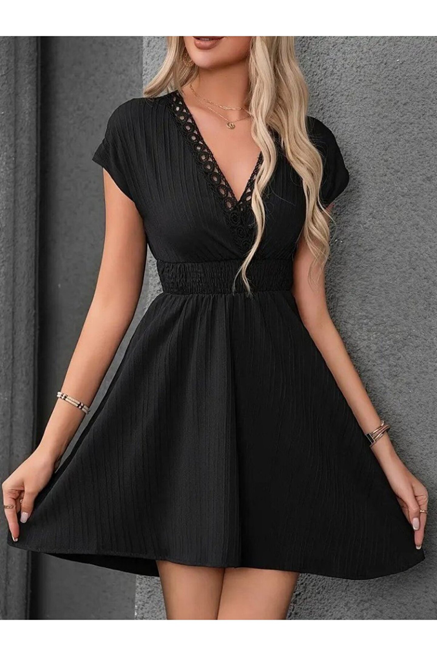 Kadın Kısa Kollu Kruvaze Yakalı Beli Lastikli Bürümcük Elbise