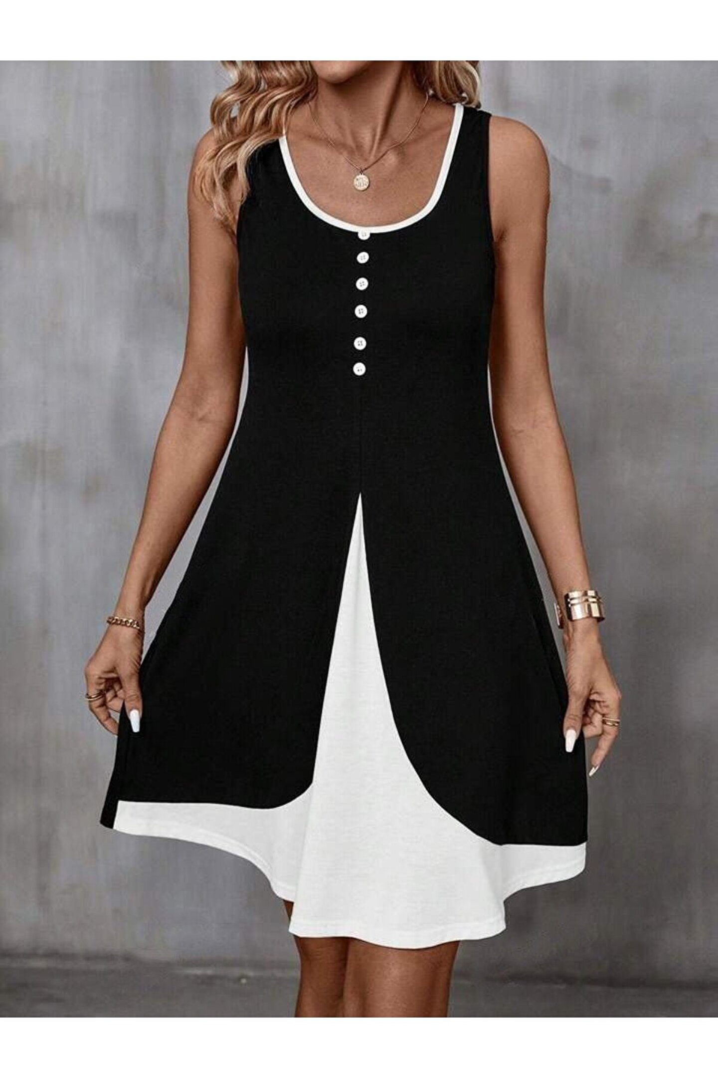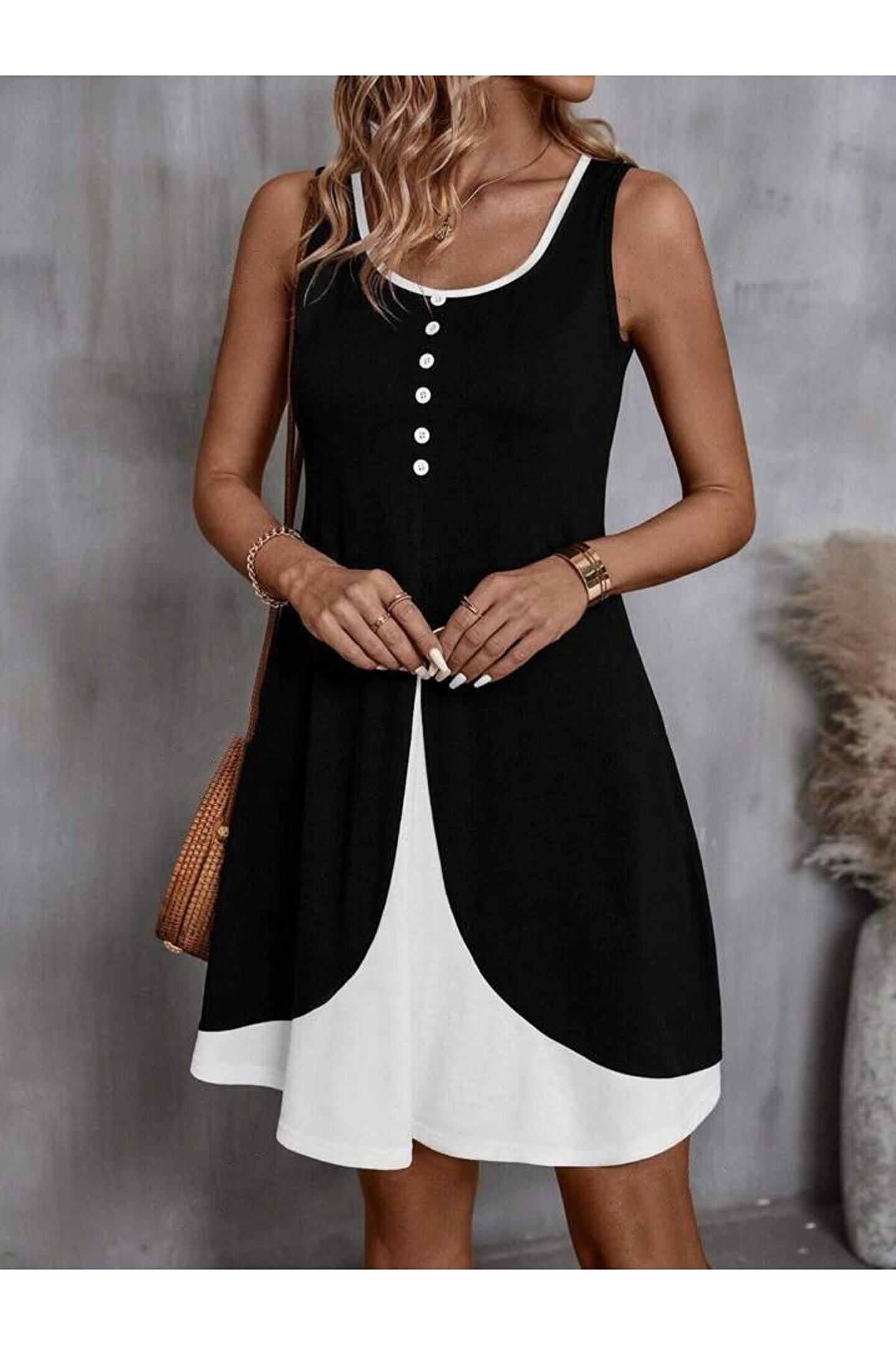 Kadın Askılı Yuvarlak Yaka önden Düğmeli çift Renkli Viskon Elbise Hediye paketi yapılır