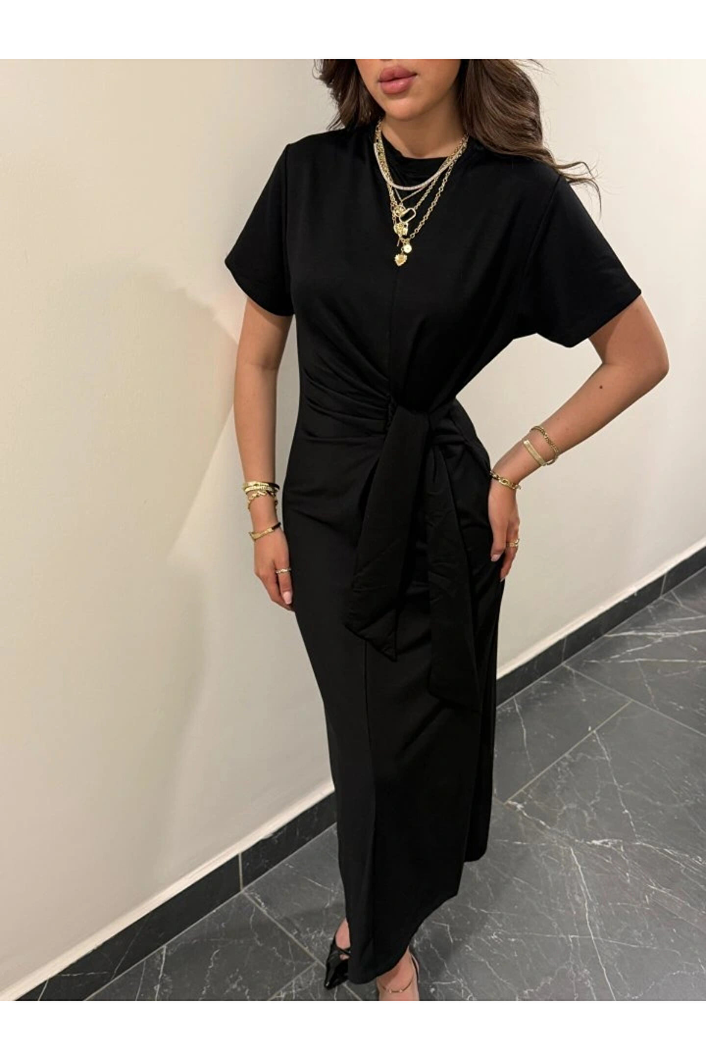 Kadın Kısa Kollu Bisiklet Yaka Yandan Bağlamalı Viskon Iki Iplik Elbise