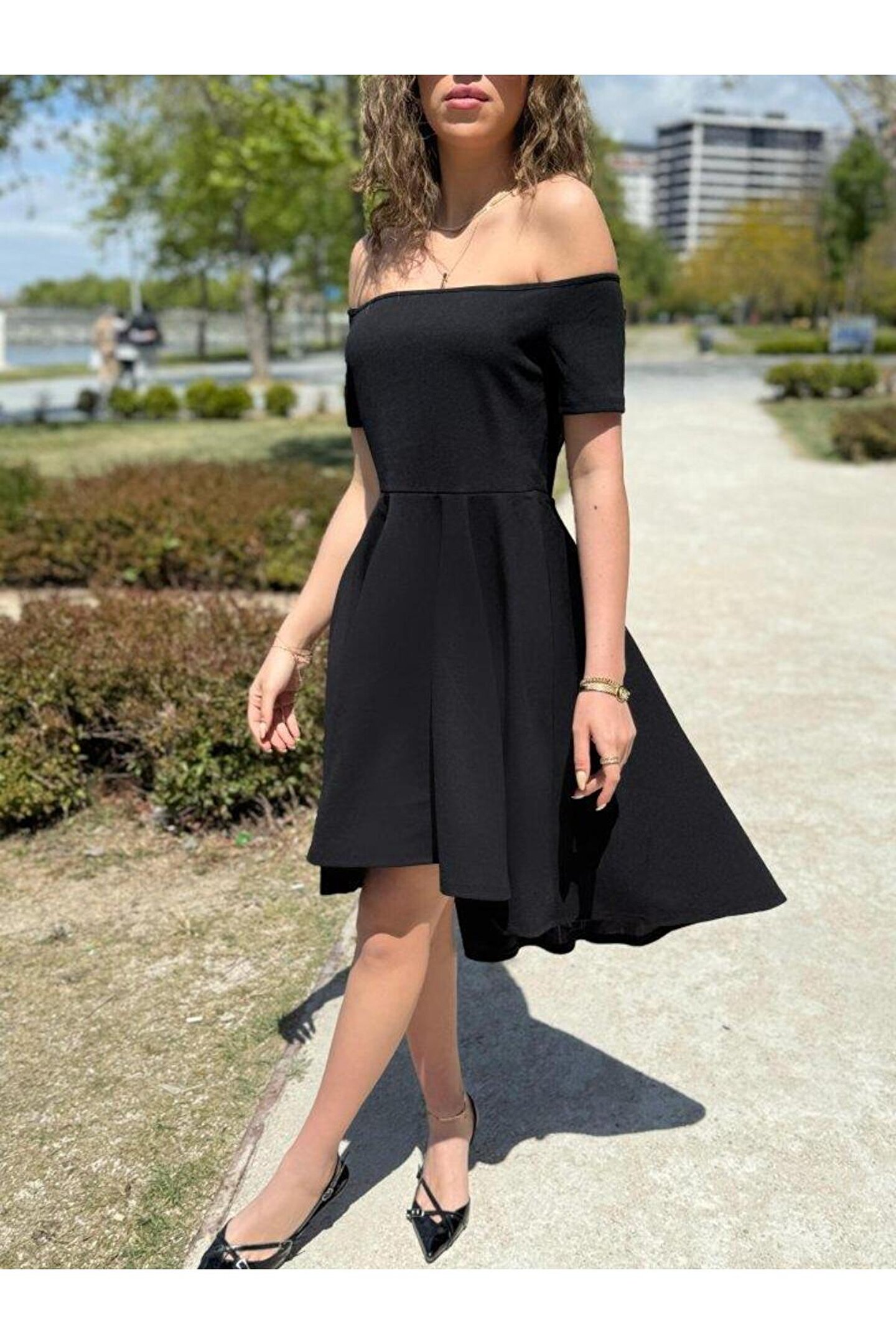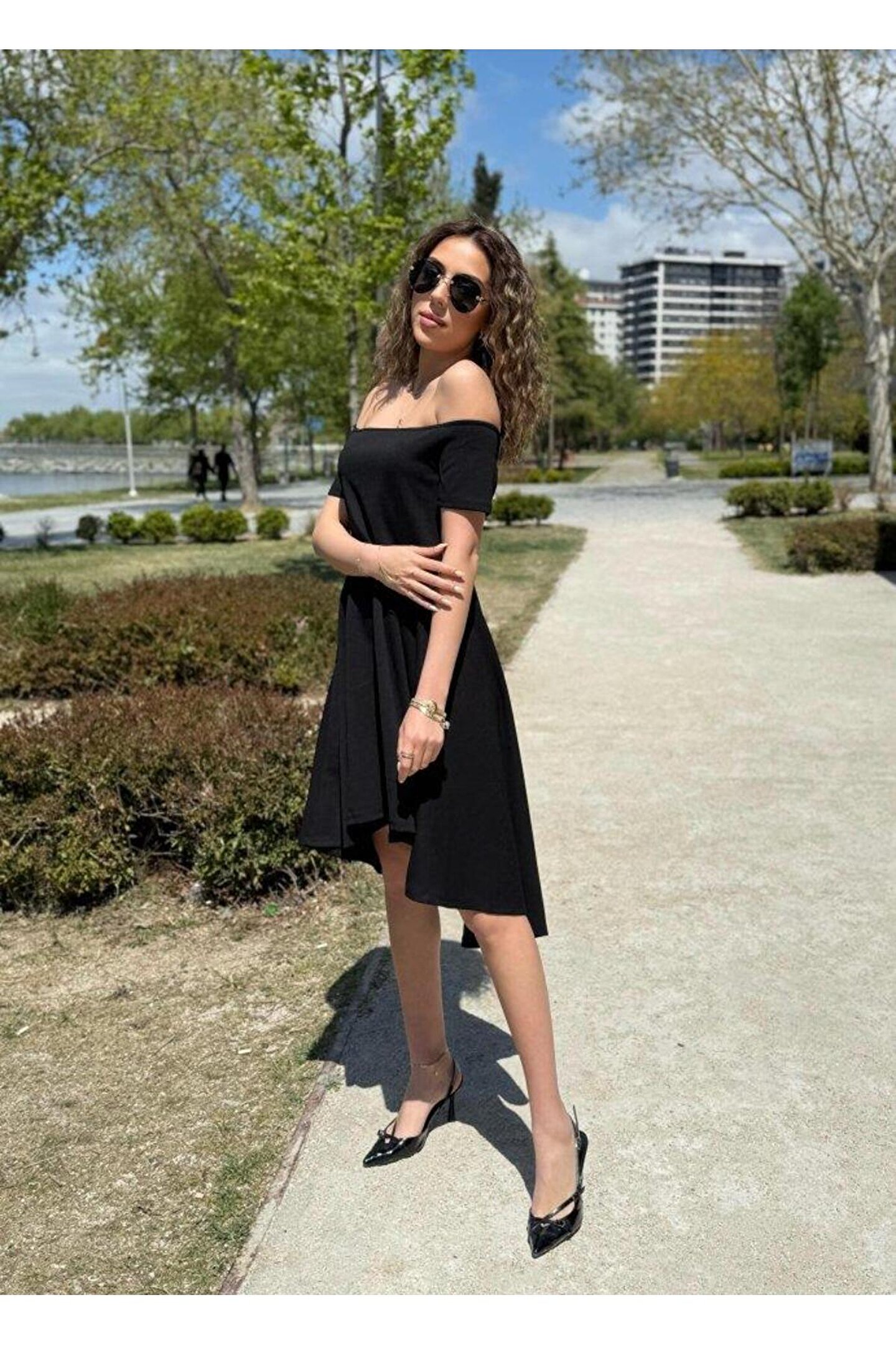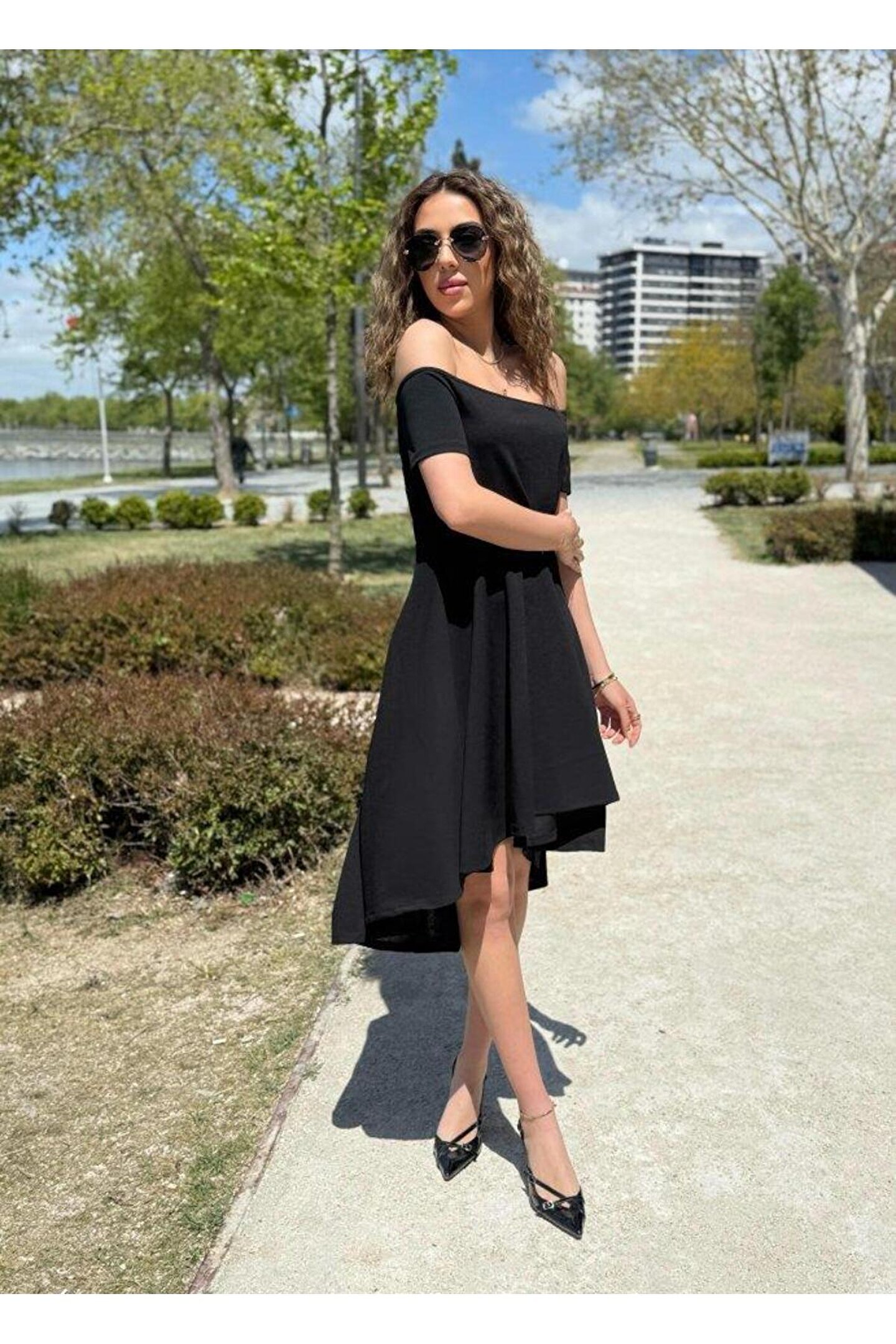 HAZEGO Kadın Kısa Kollu Madonna Yaka önü Kısa Arkası Uzun Ithal Krep Elbise