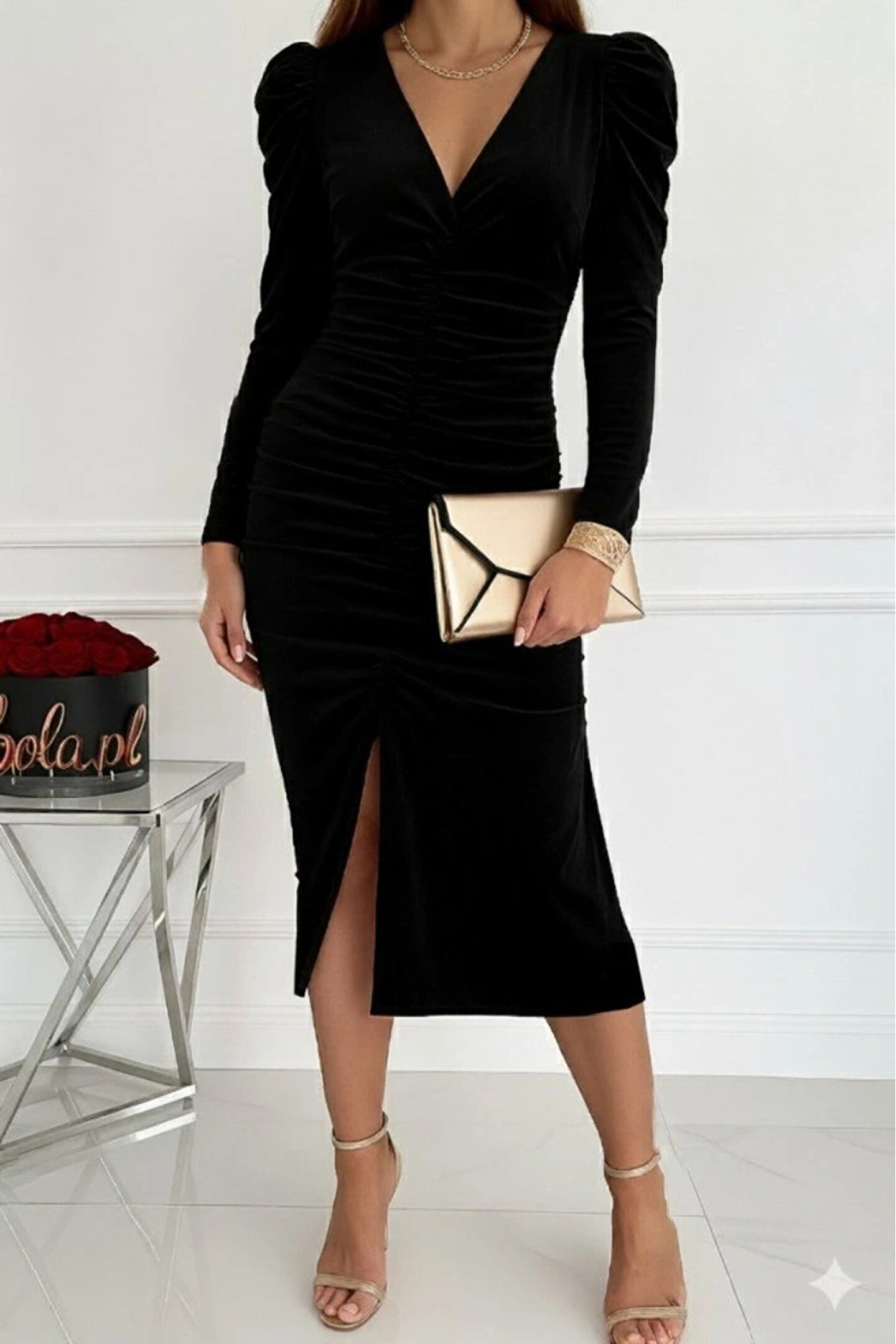 Kadın Uzun Kollu Derin Kruvaze Yakalı önden Büzgülü Yırtmaç Detaylı Kadife Midi Elbise