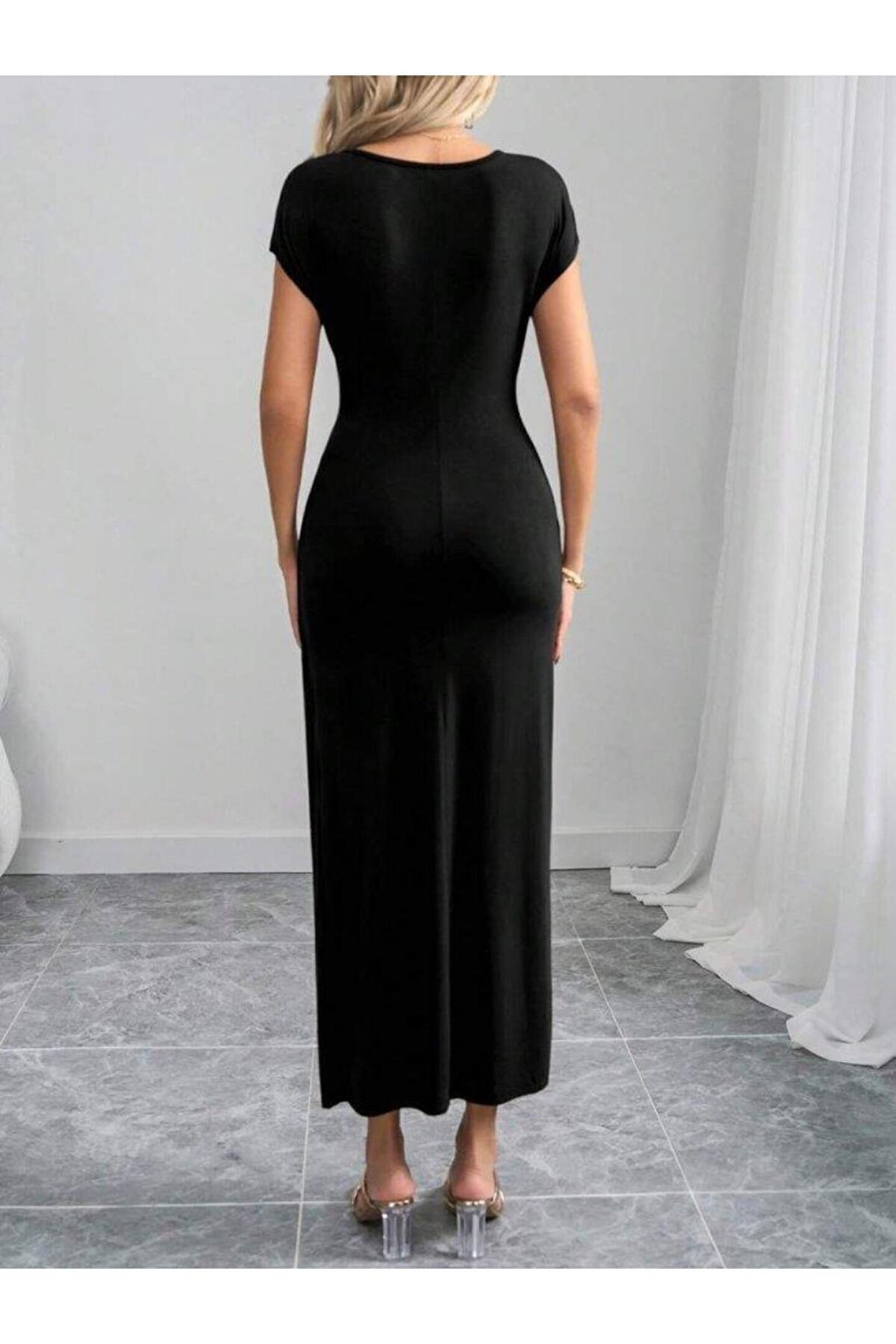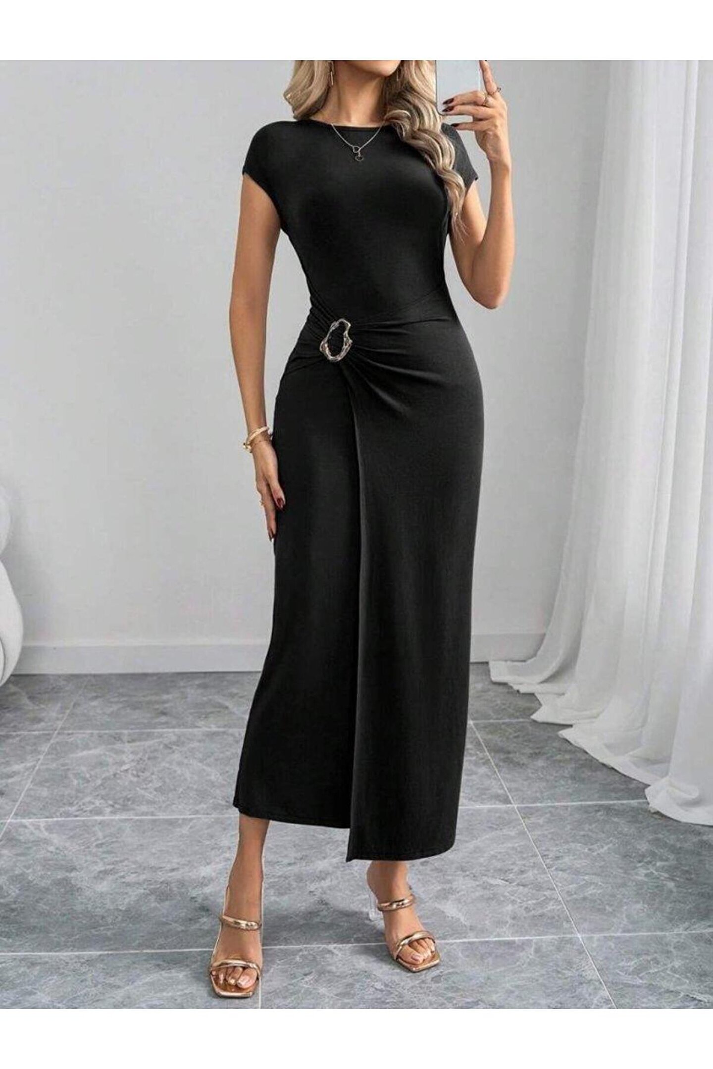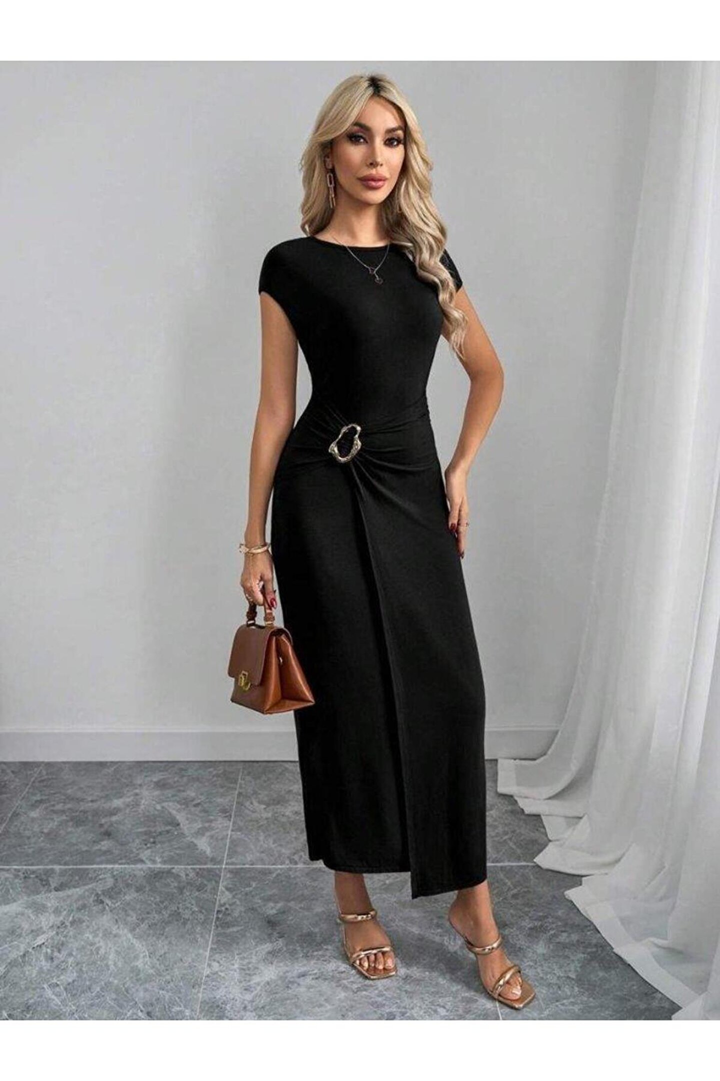 HAZEGO Kadın Yarım Ay Kollu Yuvarlak Yaka önünde Toka Detaylı Modal Maxi Elbise