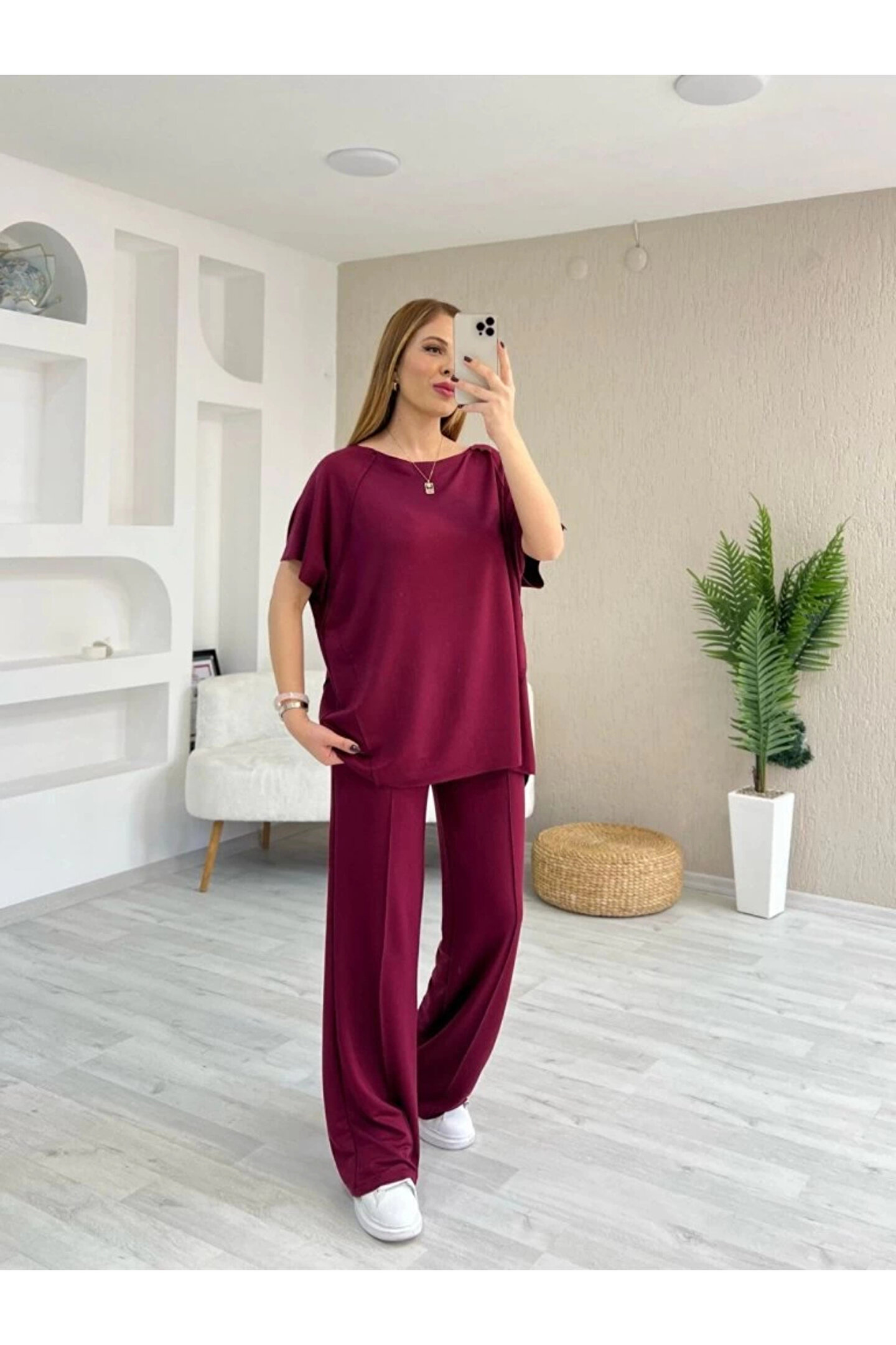 HAZEGO MDB Kadın Kısa Kollu Kayık Yakalı Dikiş Izi Detaylı Viskon Iki Iplik Bluz Ve Pantolon Ikili Takım