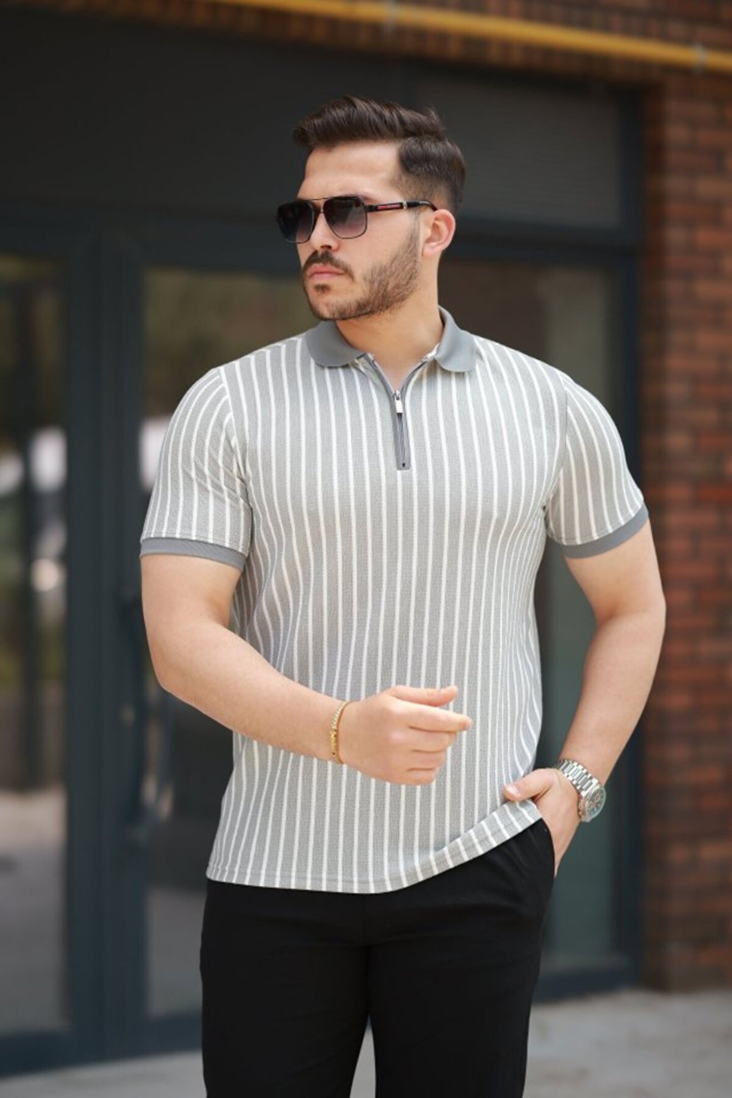 Erkek çizgili Fermuar Yakalı Kısa Kollu Tişört