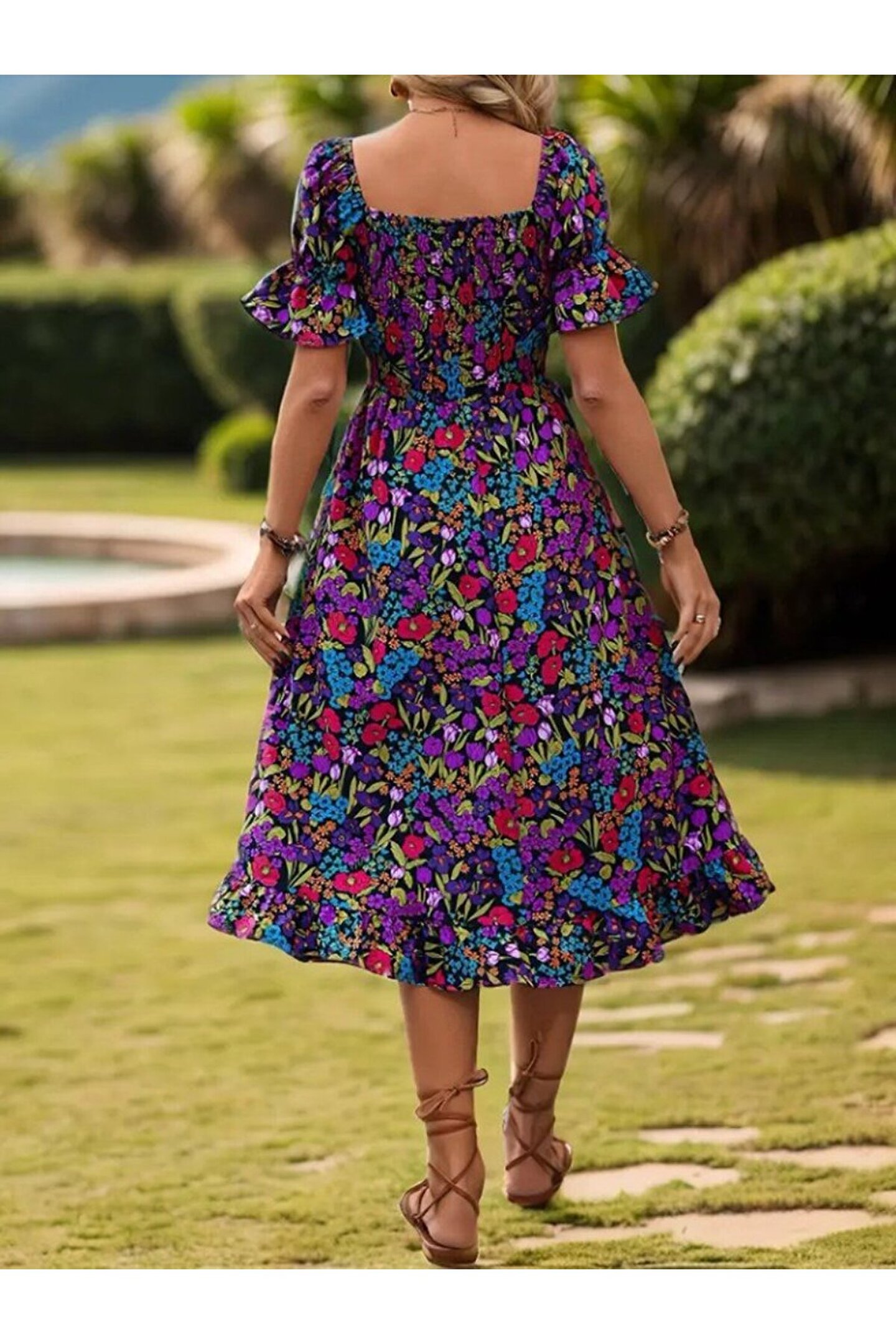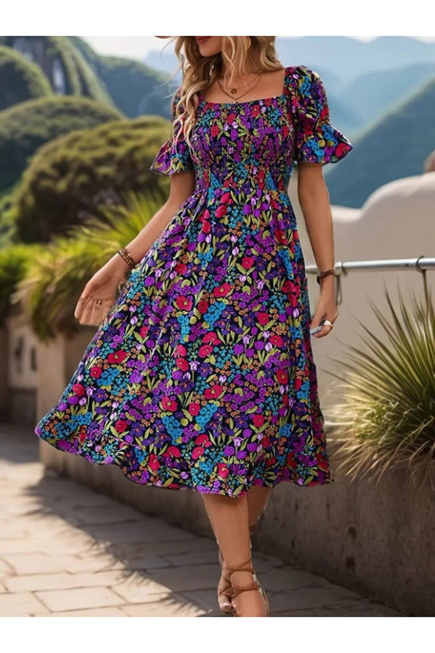 Kadın Kısa Kollu Kare Yakalı Beli Lastikli çiçek Desenli Mini Süprem Elbise