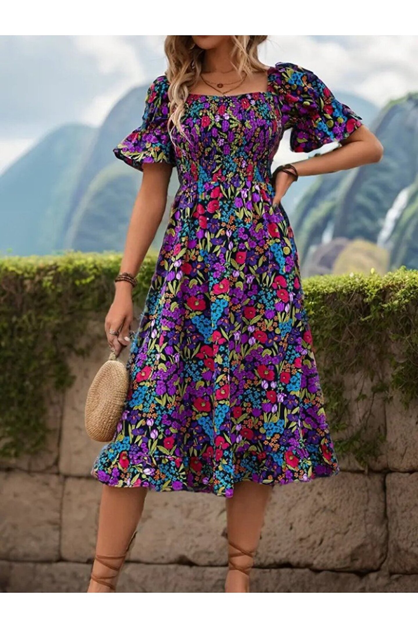 HAZEGO Turega Style Kadın Kısa Kollu Kare Yakalı Beli Lastikli çiçek Desenli Mini Süprem Elbise
