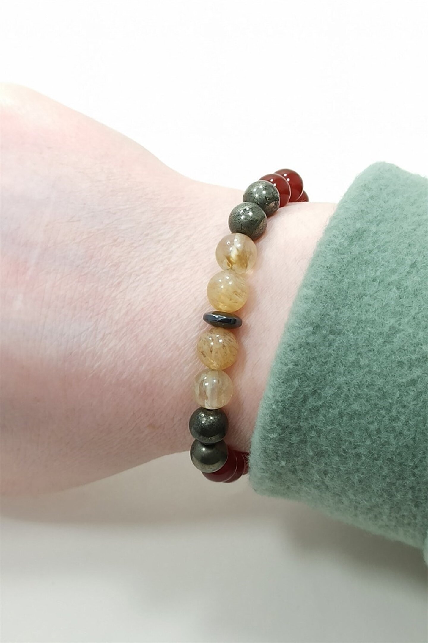 Doğal taş kullanımı sayesinde her bileklik benzersiz ve otantik bir görünüm sunar; Sitrin ve pirit akik taşı kombinasyonu, bilekliğe zarif bir parlaklık ve renk uyumu katar; Doğal taş materyali ile hem şıklığı hem de doğallığı bir arada yaşatır; Bileklik, günlük kullanım için idealdir ve her türlü kıyafetle kolayca uyum sağlar;