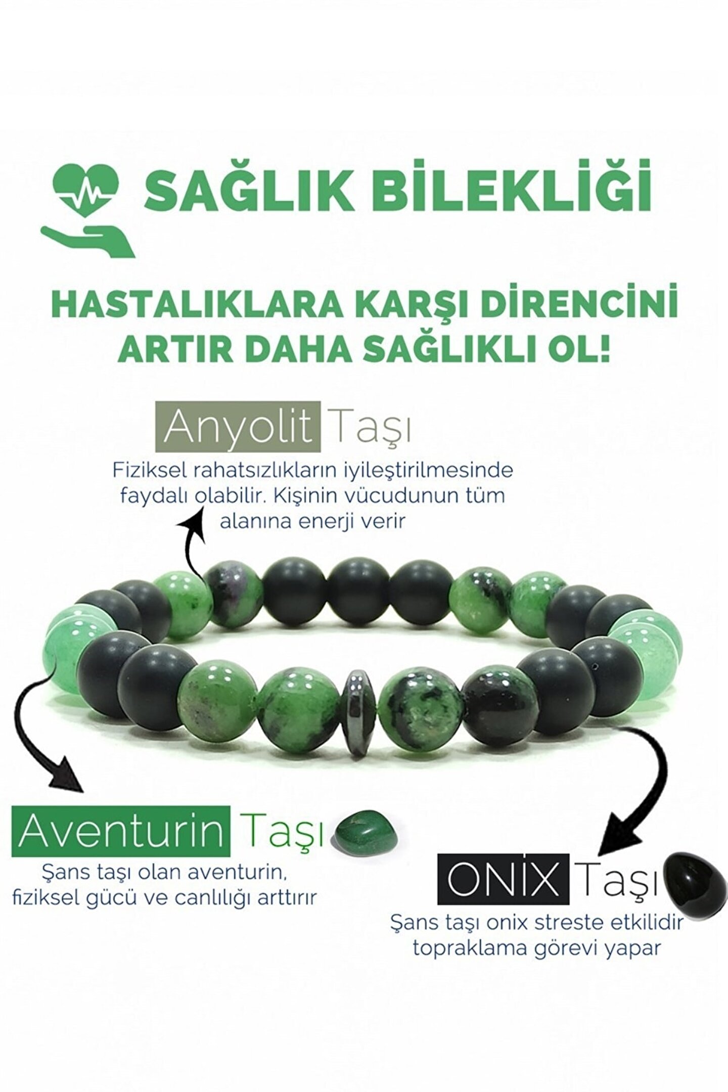 Sağlık Bilkeliği: Anyolit Aventurin Oniks Doğal Taş Bileklik: ANYOLİT TAŞI: Sağlık taşı olarak bilinir. ; Güçlü bir iyileştiricidir Bedene enerji verir. ; Algılama ve bilinç gücünü arttırır. ; Çevreye olumlu enerji yayar. ; Kronik yorgunluğa iyi gelir. ; Bağışıklık sistemini güçlendirir. ; Hücreleri yeniler. ; Asabiyeti azaltır kişiye sakinlik verir. ; Özgüveni arttırır. ; AVENTURİN TAŞI: Şans taşı olarak bilinir Fiziksel gücü ve canlılığı artırır. ; Kendinizi mutlu hissetmek için kullanabileceğiniz bir taştır. ; Psikolojik rahatsızlıklara iyi gelir. ; Hafızayı güçlendirir. ; Akıl ve zihin gücünü artırır. ; Kalp sağlığı için olumlu etkileri olan bir taştır. ; Duygusal bakımdan dengeleyicidir ve depresyona iyi gelir. ; Yüksek tansiyona iyi gelir ONİKS TAŞI: Şans taşıdır. ; Rahatlatıcı özelliği vardır. ; Konsantrasyonu sağlar. ; Zihin bulanıklığını giderir. ; Depresyondan kurtulmaya yardımcıdır. ; Strese iyi gelir ve kişiyi sakinleştirir. ; Kemik yapısını ve ilik sistemini güçlendirir. ; Obezite tedavisinde faydalıdır. ; Kişinin kendisine güvenini arttırır ve cesaret verir. ; Ayak rahatsızlıklarına iyi gelir. ; Kadın-erkek arasındaki ilişkileri dengeler. ; HEMATİT TAŞI: Olumsuz enerjiyi gidermeye yardımcıdır. ; İlişkiler üzerinde olumlu etkisi vardır. ; Kişinin kendisine güven duymasını ve kontrol etmesine yardımcıdır. ; Uykusuzluğa iyi gelir;