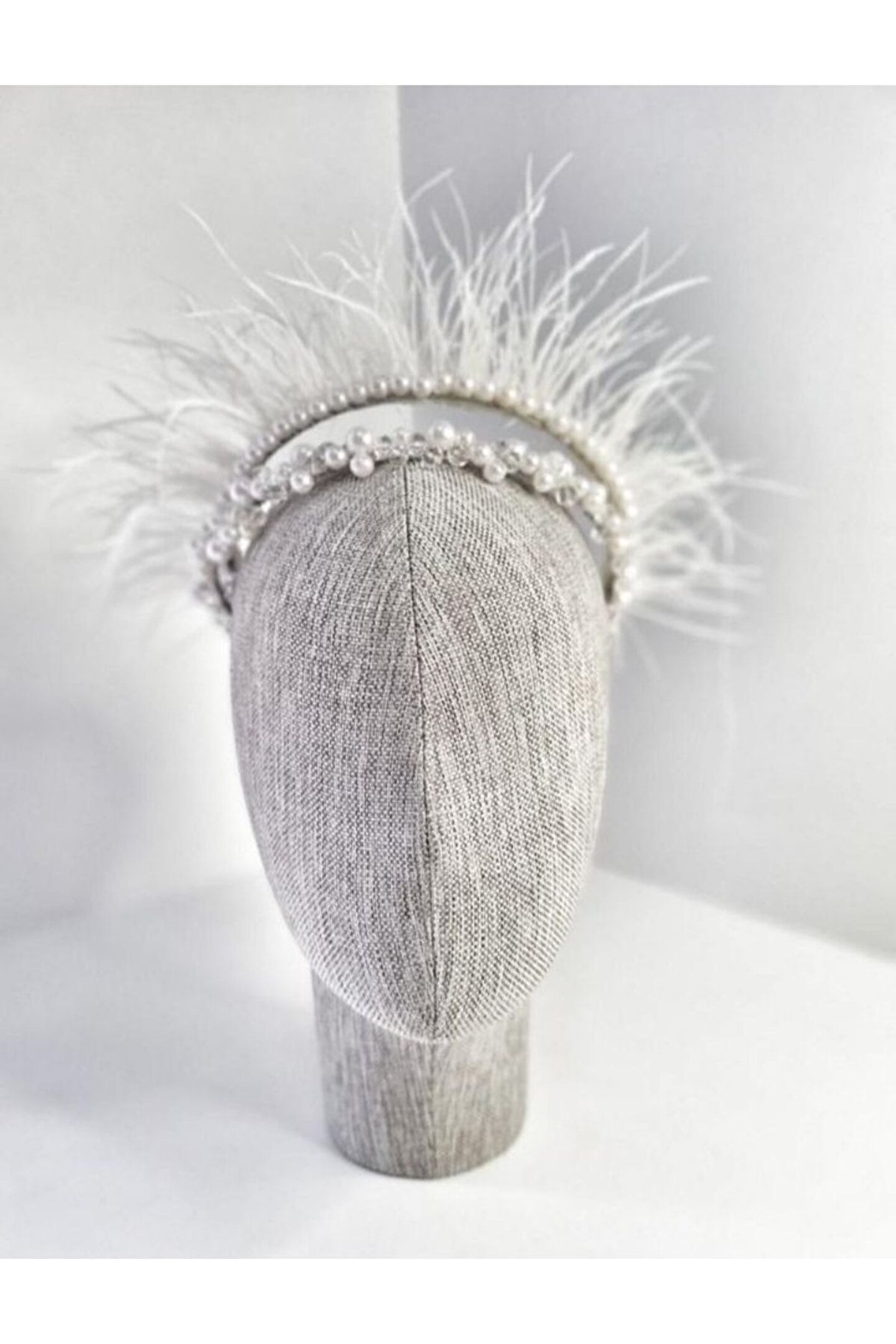 Henna Beyaz Incili Tüylü Gelin Tacı