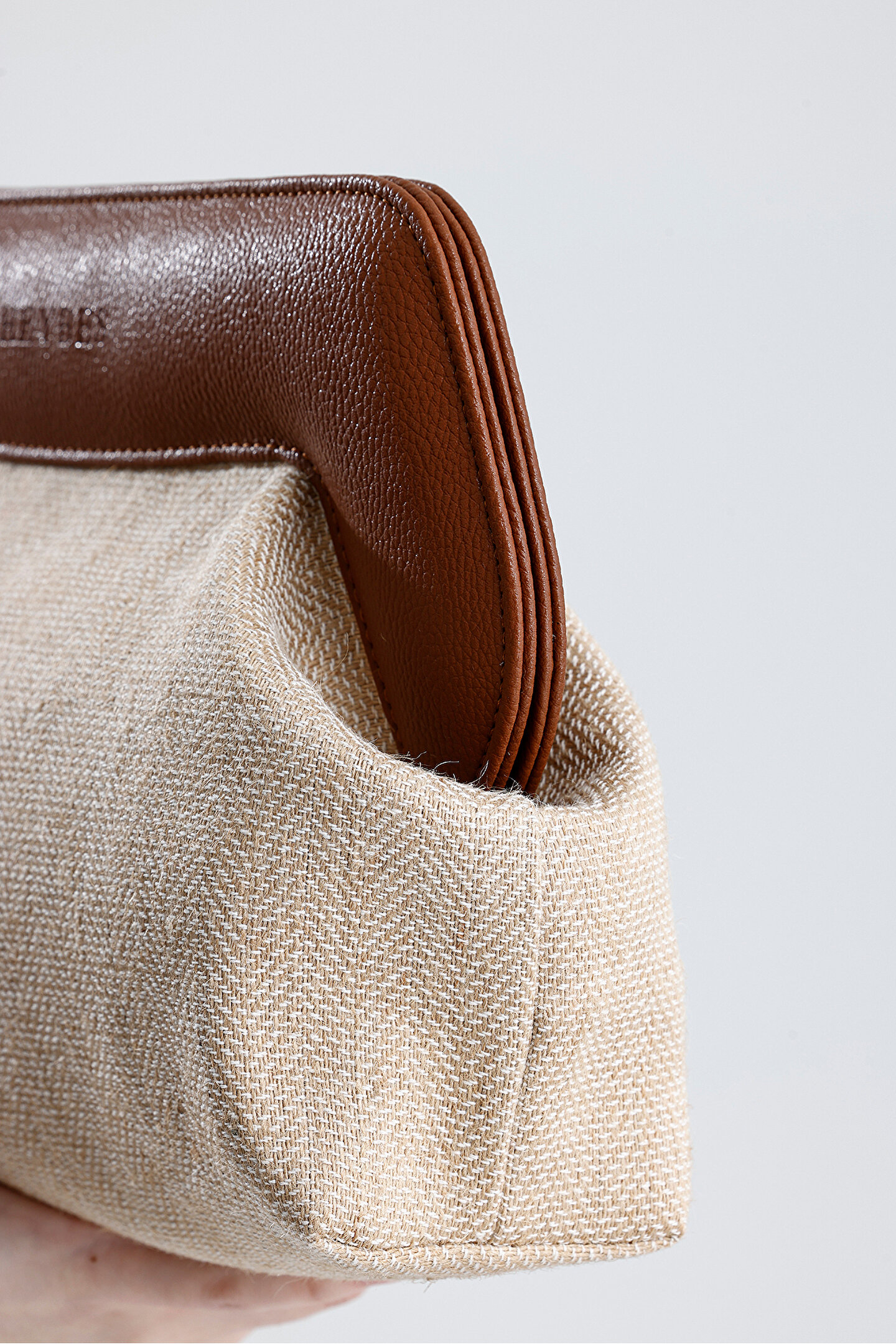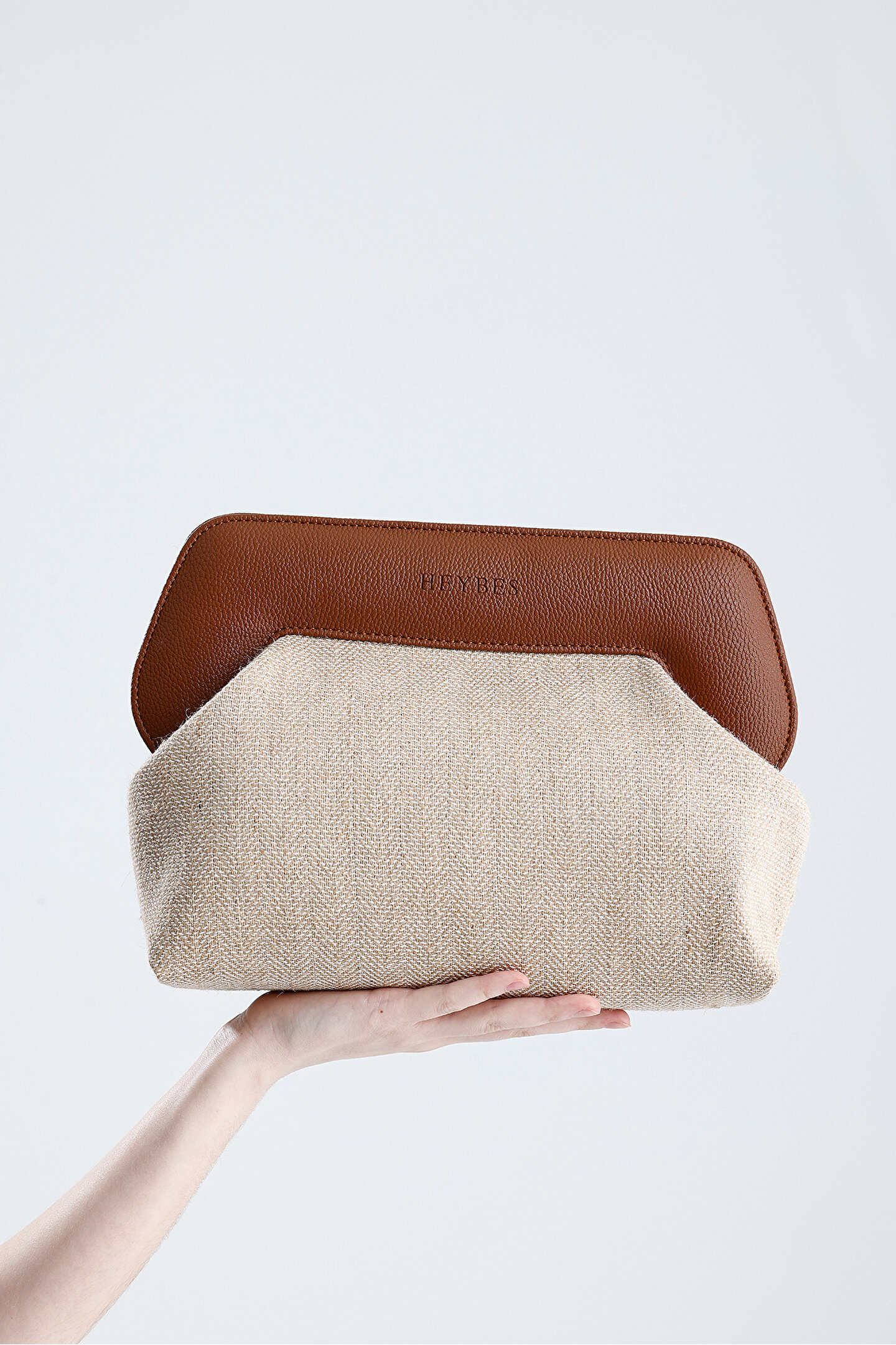 Heybes Kadın Kahverengi Çerçeveli Kendinden Desenli Jüt Clutch El Çantası; Jüt kumaşın doğal görünümüyle modern bir duruş kazanan bu clutch modeli, vegan deri detaylarıyla hem estetik hem de fonksiyonel bir şıklık sunuyor.; Göz alıcı dokusu ve rahat kullanımı sayesinde günlük kombinlere canlılık katarken, el işçiliğiyle üretilmiş yapısı sayesinde her anınıza özel bir zarafet taşıyor.; Casual ortamlarda ve şehir temposunda stilinizi tamamlamak için ideal bir seçenek.; Mıknatıs kapak sistemi pratik kullanım imkânı sunar.; Heybes tarafından özel el işçiliği ile üretilmiştir.; 34x23x11 cm (Genişlik x Yükseklik x Derinlik) ölçülerindedir.; İç hacim yükseklik: 16 cm İç hacim genişlik: 18 cm; •Gövde: Dokuma Jüt Kumaş •Çerçeve: Vegan Deri •İç Materyal: Vegan Deri