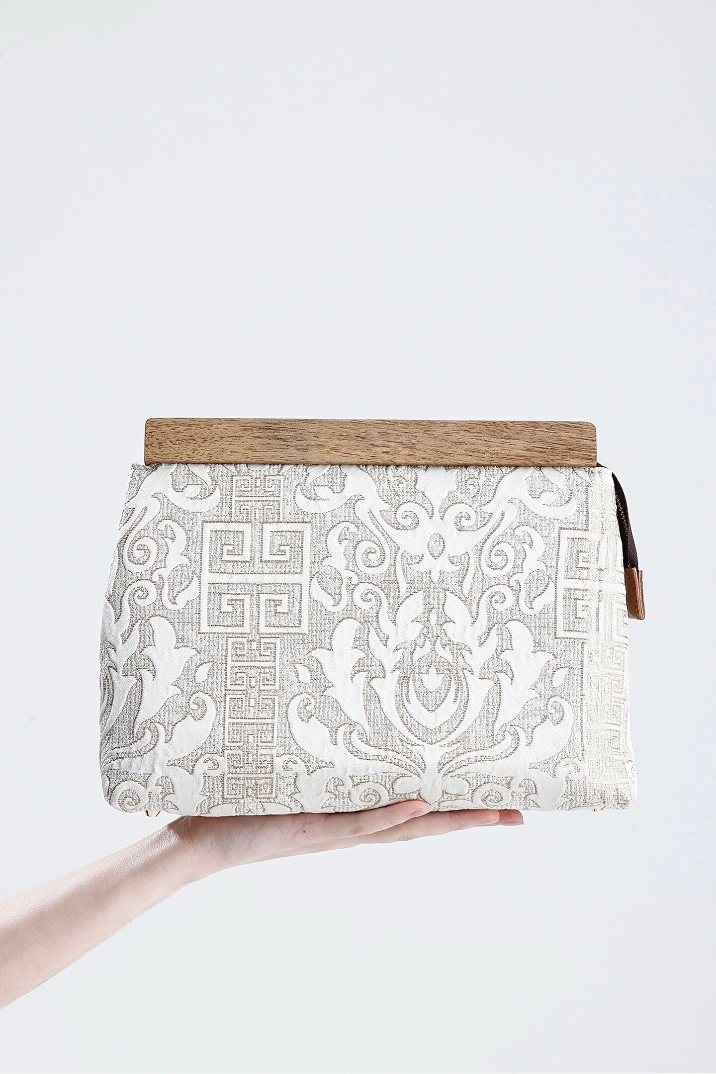Heybes Kadın Krem Otantik Desen Clutch Çanta; Ceviz ağacının doğal dokusu, etnik desenlerin zarif çizgileriyle buluştu.; Usta işçilikle şekillenen bu parça, doğallığın sıcaklığını ve kültürel esintileri bir arada sunuyor.; Astarlı iç kısmı ve tek iç cebiyle hem şık hem de kullanışlı.; Sade çizgileri, özenli detaylarla birleşerek onu sadece bir eşya olmaktan çıkarıyor, stilinizi tamamlayan özel bir dokunuş haline getiriyor.; Günlük yaşamda farklılık arayan, doğal malzemelerden gelen samimiyeti sevenler için üretildi.; Heybes tarafından özel el işçiliği ile üretilmiştir.; İç kısmı astarlıdır ve 1 adet iç cebi bulunmaktadır.; •Gövde: Dokuma Kumaş •Aksesuar: Doğal Ahşap •İç Materyal: Vegan Deri; 30x21x10 cm (Genişlik x Yükseklik x Derinlik) ölçülerindedir.; • İç hacim yükseklik: 16 cm • İç hacim genişlik: 18 cm