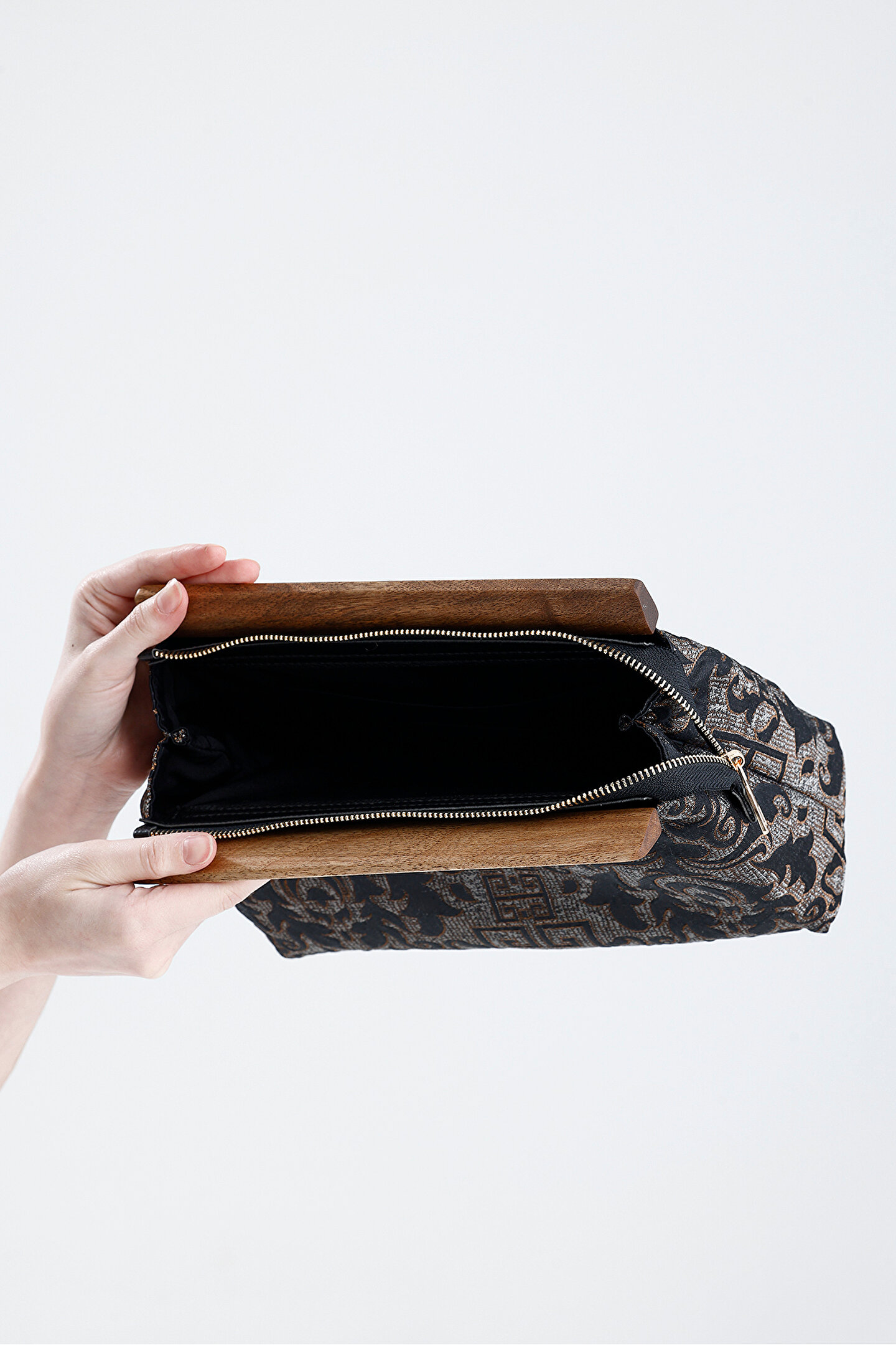 Heybes Kadın Siyah Otantik Desen Clutch Çanta; Ceviz ağacının doğal dokusu, etnik desenlerin zarif çizgileriyle buluştu.; Usta işçilikle şekillenen bu parça, doğallığın sıcaklığını ve kültürel esintileri bir arada sunuyor.; Sade çizgileri, özenli detaylarla birleşerek onu sadece bir eşya olmaktan çıkarıyor, stilinizi tamamlayan özel bir dokunuş haline getiriyor.; Günlük yaşamda farklılık arayan, doğal malzemelerden gelen samimiyeti sevenler için üretildi.; Heybes tarafından özel el işçiliği ile üretilmiştir.; İç kısmı astarlıdır ve 1 adet iç cebi bulunmaktadır.; •Gövde: Dokuma Kumaş •Aksesuar: Doğal Ahşap •İç Materyal: Vegan Deri; 30x21x10 cm (Genişlik x Yükseklik x Derinlik) ölçülerindedir.; • İç hacim yükseklik: 16 cm • İç hacim genişlik: 18 cm