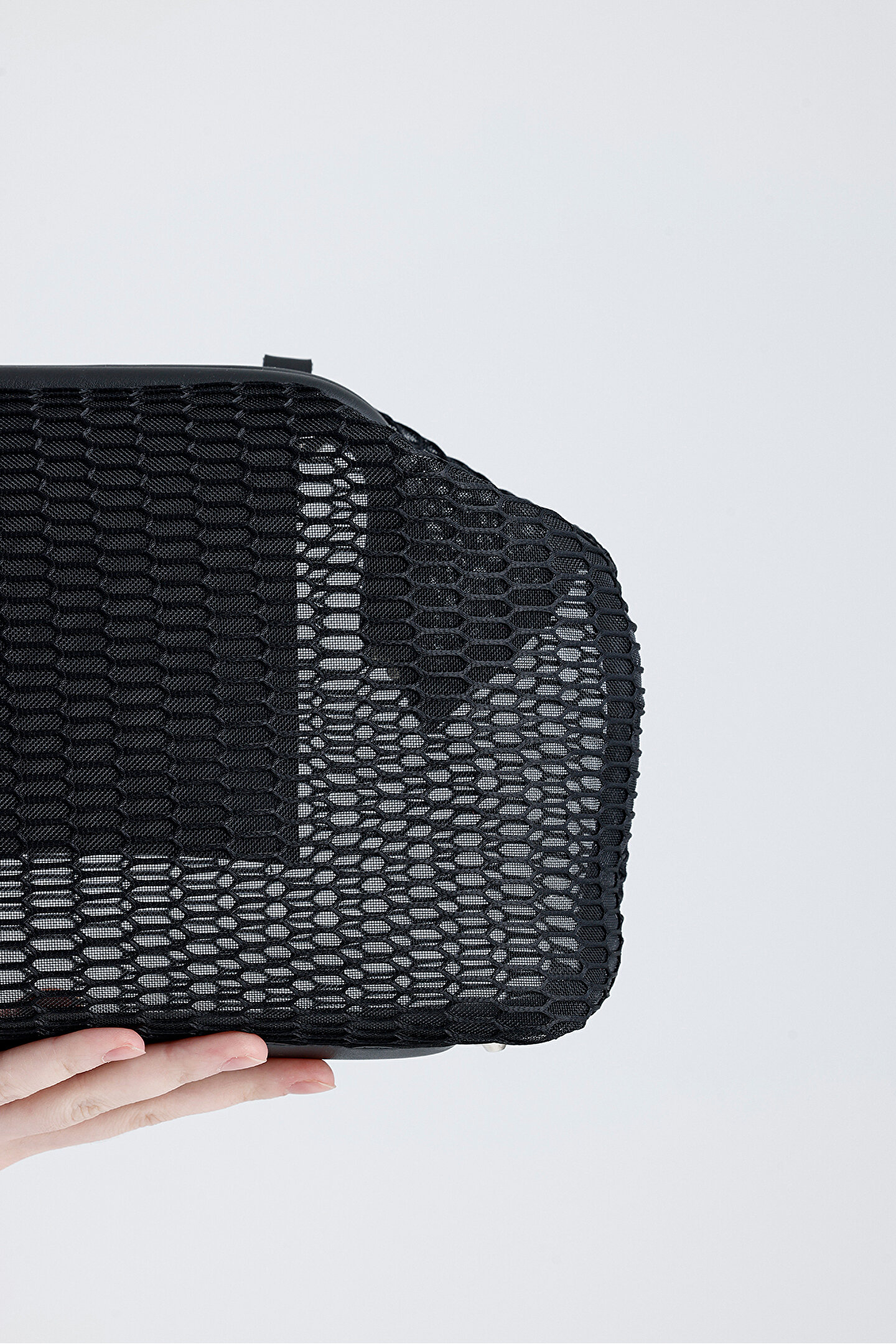Heybes Kadın Siyah Petek Desenli Şeffaf Clutch El Çantası; Yetişkin yaş grubuna hitap eden zarif bir aksesuar.; Siyah rengiyle her türlü kıyafetle kolayca uyum sağlar.; File materyali sayesinde hafif ve dayanıklı yapıya sahip, uzun süreli kullanım için uygundur.; Örme kumaş tipi ile esneklik ve rahatlık sunarken, desenli yapısıyla görsel bir zenginlik katar.; Kilit kapama sistemi pratik kullanmak imkânı sunar.; Heybes tarafından özel el işçiliği ile üretilmiştir.; 1 adet iç cebi bulunmaktadır.; 28x19x10 cm (Genişlik x Yükseklik x Derinlik) ölçülerindedir.