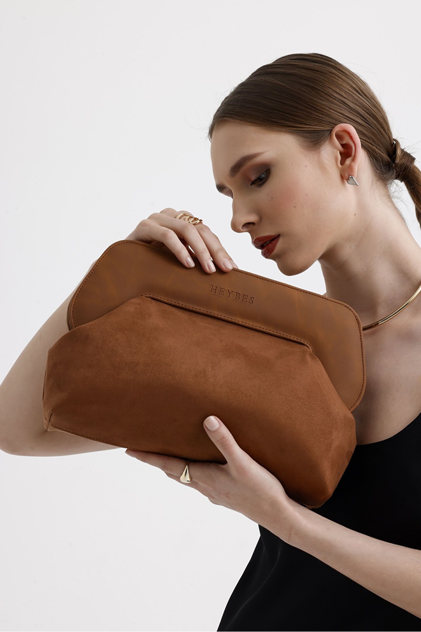 Zarif tasarımıyla dikkat çeken Heybes kadın taba süet el çantası, hem gündüz hem de gece kullanımına uygun şıklığı sunar.; Düz deseniyle sadelikten yana olanların tercihi olup, her türlü kıyafetle uyum içinde kullanılabilir.; Hem süet hem de vegan deriden oluşan materyal bileşeni sayesinde dayanıklılık ve konforu bir arada sunar.; Taba rengiyle sofistike bir görünüm kazandırırken, günlük kullanımda rahatlıkla tercih edilebilecek ideal bir seçenektir.; Mıknatıs kapak sistemi pratik kullanım imkânı sunar.; Heybes tarafından özel el işçiliği ile üretilmiştir.; İç kısmı astarlıdır ve 1 adet iç cebi bulunmaktadır.; •Gövde: Dokuma Süet •Çerçeve: Vegan Deri •İç Materyal: Vegan Deri; 34x23x11 cm (Genişlik x Yükseklik x Derinlik) ölçülerindedir.; • İç hacim yükseklik: 16 cm • İç hacim genişlik: 18 cm